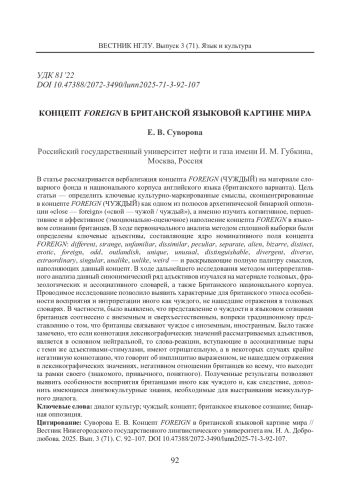 В статье рассматривается вербализация концепта FOREIGN (ЧУЖДЫЙ) на материале словарного фонда и национального корпуса английского языка (британского варианта). Цель статьи - определить ключевые культурно-маркированные смыслы, сконцентрированные в концепте FOREIGN (ЧУЖДЫЙ) как одном из полюсов архетипической бинарной оппозиции «close - foreign» («свой - чужой / чуждый»), а именно изучить когнитивное, перцептивное и аффективное (эмоционально-оценочное) наполнение концепта FOREIGN в языковом сознании британцев. В ходе первоначального анализа методом сплошной выборки были определены ключевые адъективы, составляющие ядро номинативного поля концепта FOREIGN: different, strange, unfamiliar, dissimilar, peculiar, separate, alien, bizarre, distinct, exotic, foreign, odd, outlandish, unique, unusual, distinguishable, divergent, diverse, extraordinary, singular, unalike, unlike, weird - и раскрывающие полную палитру смыслов, наполняющих данный концепт. В ходе дальнейшего исследования методом интерпретативного анализа данный синонимический ряд адъективов изучался на материале толковых, фразеологических и ассоциативного словарей, а также Британского национального корпуса. Проводимое исследование позволило выявить характерные для британского этноса особенности восприятия и интрпретации иного как чуждого, не нашедшие отражения в толковых словарях. В частности, было выявлено, что представление о чуждости в языковом сознании британцев соотнесено с внеземным и сверхъестественным, вопреки традиционному представлению о том, что британцы связывают чуждое с иноземным, иностранным. Было также замечено, что если коннотация лексикографических значений рассматриваемых адъективов, является в основном нейтральной, то слова-реакции, вступающие в ассоциативные пары с теми же адъективами-стимулами, имеют отрицательную, а в некоторых случаях крайне негативную коннотацию, что говорит об имплицитно выраженном, не нашедшем отражения в лексикографических значениях, негативном отношении британцев ко всему, что выходит за рамки своего (знакомого, привычного, понятного). Полученные результаты позволяют выявить особенности восприятия британцами иного как чуждого и, как следствие, дополнить имеющиеся лингвокультурные знания, необходимые для выстраивания межкультурного диалога.