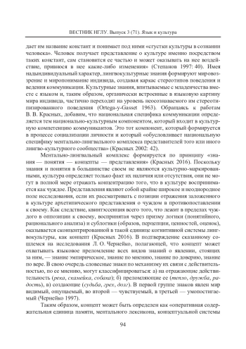 Ментально-лингвальный комплекс формируется по принципу «знания — понятия — концепты — представления» (Красных 2016). Поскольку знания и понятия в большинстве своем не являются культурно-маркированными, культура определяет только факт их наличия или отсутствия, они не могут в полной мере отражать концентрацию того, что в культуре воспринимается как чуждое. Представления являют собой крайне широкое и неоднородное поле исследования, если их рассматривать с позиции отражения заложенного в культуре архетипического представления о чуждом в противопоставлении к своему. Как следствие, квинтэссенция всего того, что лежит в пределах чуждого в оппозиции к своему, воспринятая через призму логики (понятийного, рационального анализа) и сублогики (образов, перцепции, ценностей, оценок), оказывается сконцентрированной в такой единице когнитивной системы лингвокультуры, как концепт (Красных 2016). В подтверждение сказанному сошлемся на исследования Л. О. Чернейко, полагающей, что концепт может охватывать языковое преломление всех видов знаний о явлении, стоящих за ним, — знание эмпирическое, знание по мнению, знание по доверию, знание по вере.