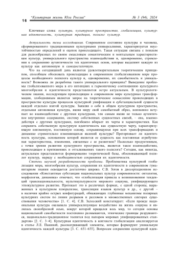В статье определяется влияние глобализации на культурное многообразие и идентичность, анализируются процессы, способствующие сохранению или разрушению культурного многообразия в условиях глобализации. Автором исследуется взаимосвязь между глобализацией и формированием культурной идентичности, противостояние и синергия глобальных и локальных векторов в развитии пространства культуры. Идентичность и многообразие культур, происходящая глобализация объединены единым концептуальным пространством культуры, следствием чего является их взаимодействие, инициирующее возникновение новых культурных форм.