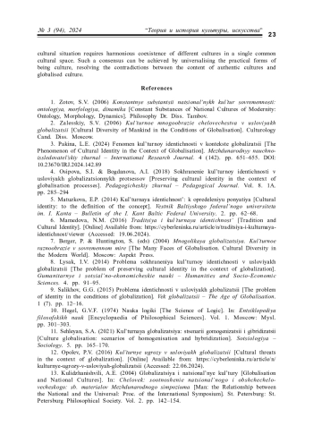 18. Балашова К.И. Национальные культуры в контексте всемирной глобализации // Молодой ученый. 2021. № 27 (369). С. 291-294. EDN: RZEEMX