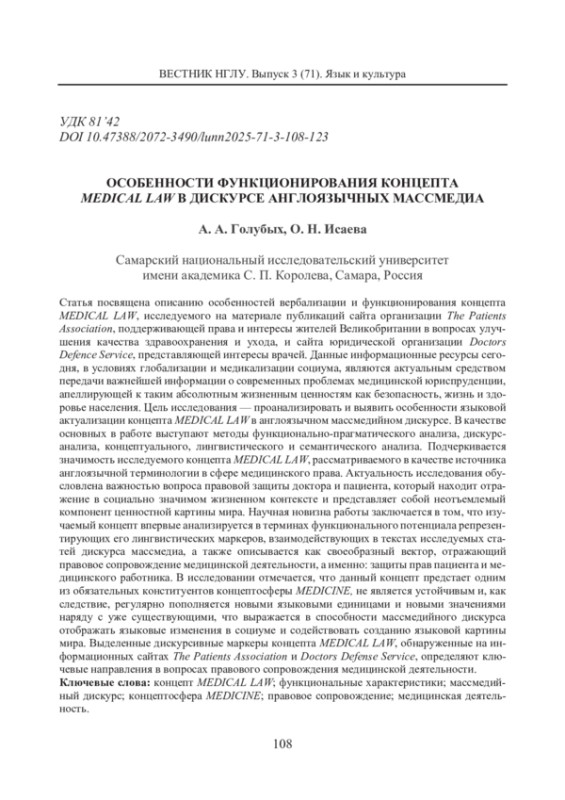 Статья посвящена описанию особенностей вербализации и функционирования концепта MEDICAL LAW, исследуемого на материале публикаций сайта организации The Patients Association, поддерживающей права и интересы жителей Великобритании в вопросах улучшения качества здравоохранения и ухода, и сайта юридической организации Doctors Defence Service, представляющей интересы врачей. Данные информационные ресурсы сегодня, в условиях глобализации и медикализации социума, являются актуальным средством передачи важнейшей информации о современных проблемах медицинской юриспруденции, апеллирующей к таким абсолютным жизненным ценностям как безопасность, жизнь и здоровье населения. Цель исследования - проанализировать и выявить особенности языковой актуализации концепта MEDICAL LAW в англоязычном массмедийном дискурсе. В качестве основных в работе выступают методы функционально-прагматического анализа, дискурс-анализа, концептуального, лингвистического и семантического анализа. Подчеркивается значимость исследуемого концепта MEDICAL LAW, рассматриваемого в качестве источника англоязычной терминологии в сфере медицинского права. Актуальность исследования обусловлена важностью вопроса правовой защиты доктора и пациента, который находит отражение в социально значимом жизненном контексте и представляет собой неотъемлемый компонент ценностной картины мира. Научная новизна работы заключается в том, что изучаемый концепт впервые анализируется в терминах функционального потенциала репрезентирующих его лингвистических маркеров, взаимодействующих в текстах исследуемых статей дискурса массмедиа, а также описывается как своеобразный вектор, отражающий правовое сопровождение медицинской деятельности, а именно: защиты прав пациента и медицинского работника. В исследовании отмечается, что данный концепт предстает одним из обязательных конституентов концептосферы MEDICINE, не является устойчивым и, как следствие, регулярно пополняется новыми языковыми единицами и новыми значениями наряду с уже существующими, что выражается в способности массмедийного дискурса отображать языковые изменения в социуме и содействовать созданию языковой картины мира. Выделенные дискурсивные маркеры концепта MEDICAL LAW, обнаруженные на информационных сайтах The Patients Association и Doctors Defense Service, определяют ключевые направления в вопросах правового сопровождения медицинской деятельности.
