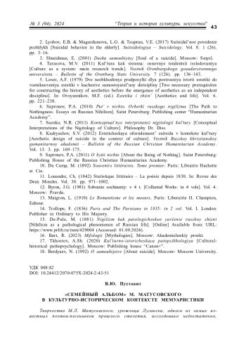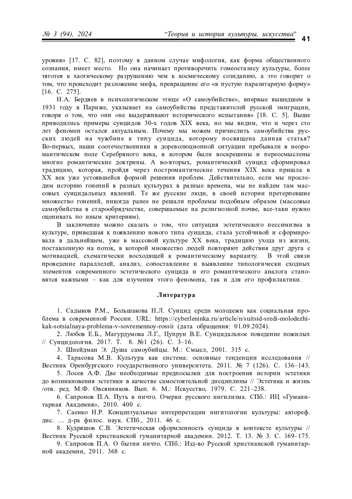 8. Кудряшов С.В. Эстетическая оформленность суицида в контексте культуры // Вестник Русской христианской гуманитарной академии. 2012. Т. 13. № 3. С. 169-175. EDN: PVZFTX