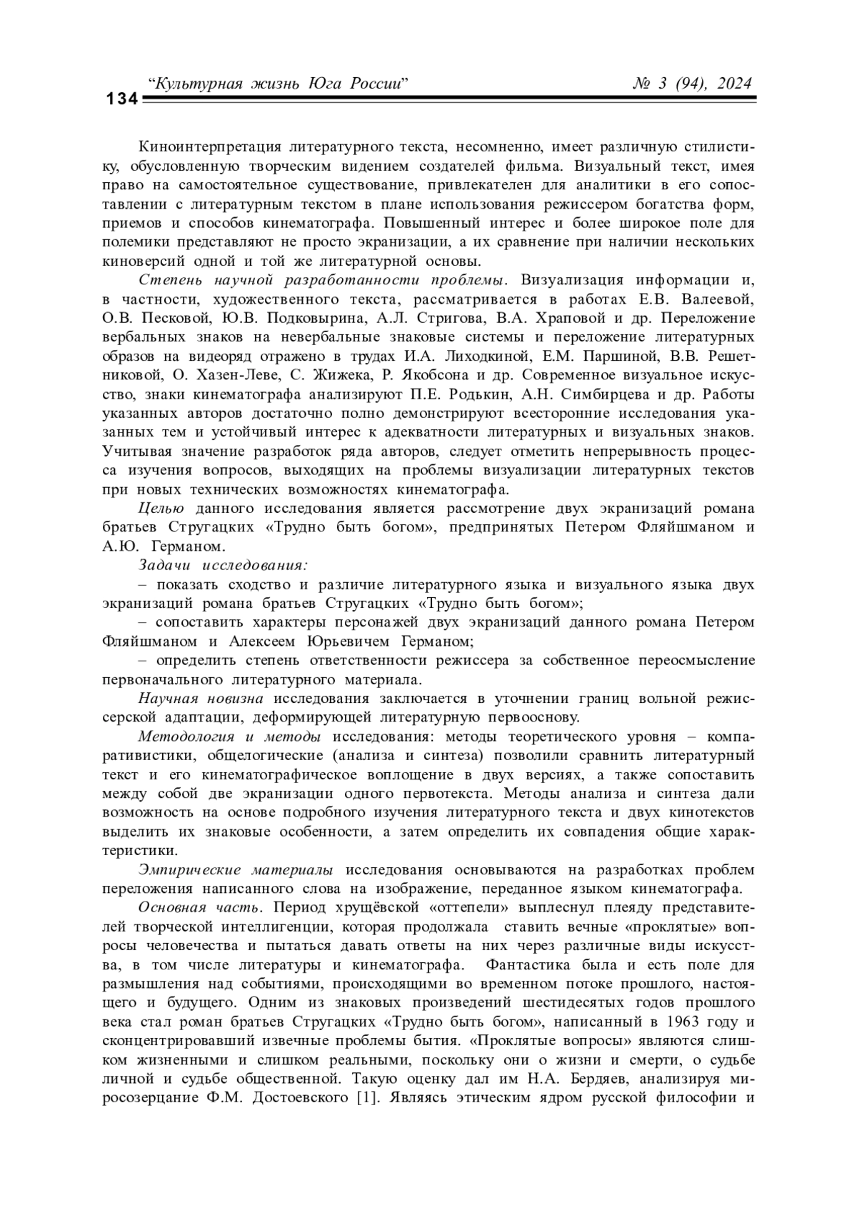 Переложение литературы на другие знаковые системы ставит перед интерпретаторами ряд задач перевода и границ разрешения свободного осмысления первотекста. В связи с расширением поля интерпретирования литературных текстов кинематографом актуализируется проблема границ субъективного видения авторами экранного воплощения прочтения первоосновы. На примере двух киноверсий режиссерами Петером Фляйшманом и Алексеем Юрьевичем Германом одного литературного произведения – романа братьев Стругацких «Трудно быть богом» – рассматривается адекватность знаков литературного и визуального текстов. Делается вывод о том, что обе версии – не прямая экранизация или не экранизация по мотивам художественного произведения, а вольная киноадаптация