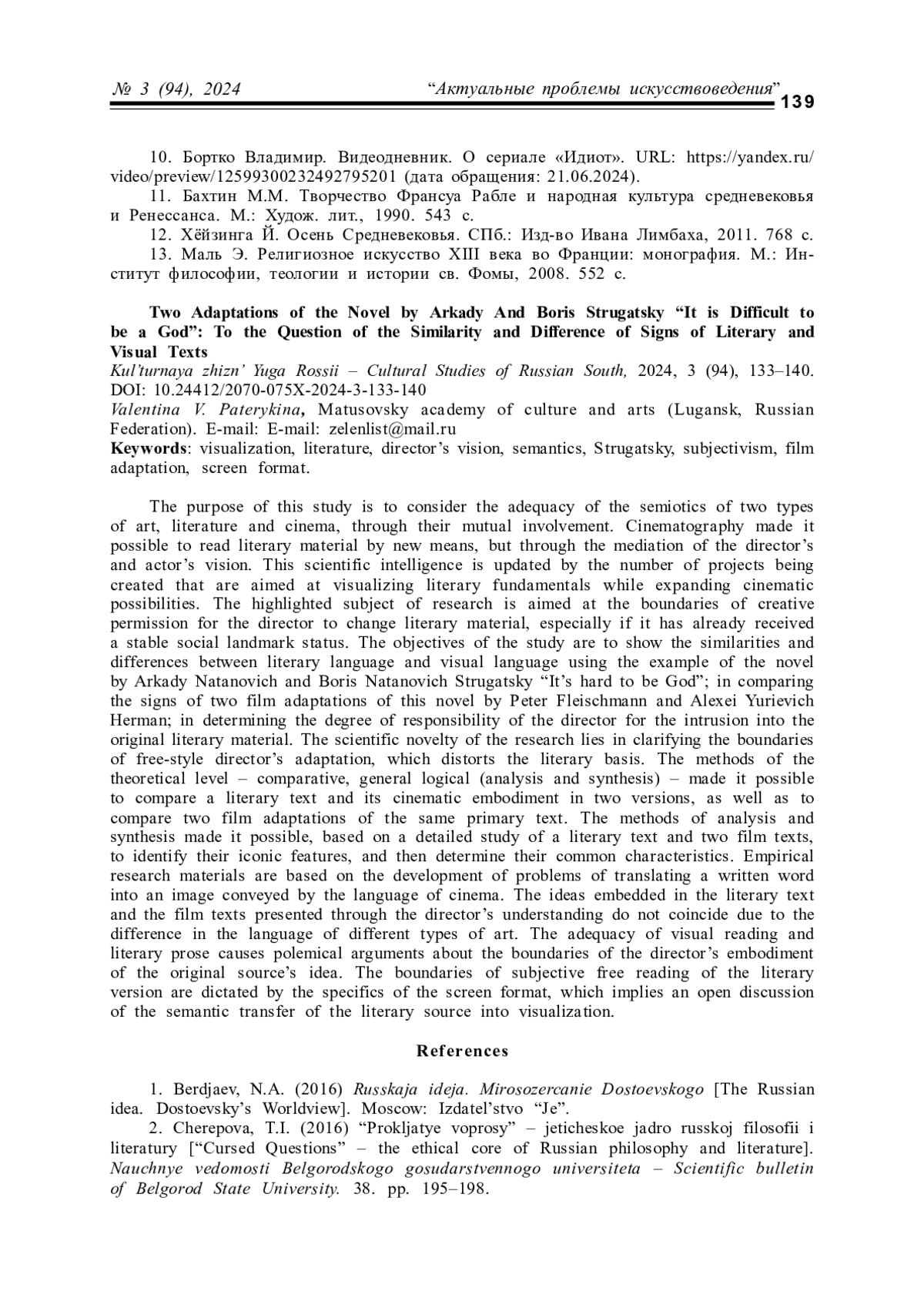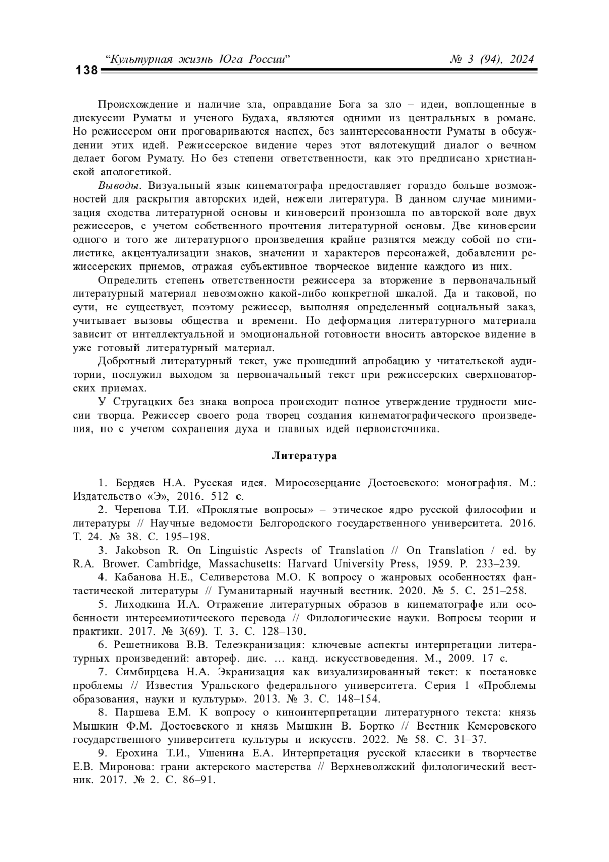 8. Паршева Е.М. К вопросу о киноинтерпретации литературного текста: князь Мышкин Ф.М. Достоевского и князь Мышкин В. Бортко // Вестник Кемеровского государственного университета культуры и искусств. 2022. № 58. С. 31-37. EDN: KCFCRM