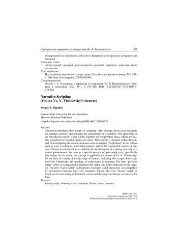 В статье вводится понятие «сценарность», позволяющее обозначить активность рассказчика, предшествующую построению нарратива. Специфика вводимого понятия в том, что оно связывает воедино несколько проблемных областей, которые, как правило, рассматриваются изолированно друг от друга. Понятие помещено в контекст изучения ментальных структур, сопутствующих «взрыву» в культуре, – войнам, революциям, индивидуальным травмам, и в то же время в трансмедиальный контекст – кинематограф рассматривается в качестве условия формирования сценарности не только как ментального феномена, но как особой практики порождения текстов – киносценариев. Будучи понятием синтетическим, сценарность позволяет расширить круг явлений, осмысляемых на основе универсалий когнитивной нарратологии – фреймов, скриптов и схем мышления. В статье понятие применяется к творчеству Вс. В. Вишневского. На основе изучения широкого круга источников – киносценариев, дневников, писем – предлагается типология форм сценарности. Персональный сценарий программирует вербальное и телесное поведение рассказчика, а социальный – призван в первую очередь обеспечить социальное взаимодействие (на примере участников съемочной группы), наконец, «сценарий истории» основан на прогнозировании исторических событий и обращении к истории как материалу для фильмов.