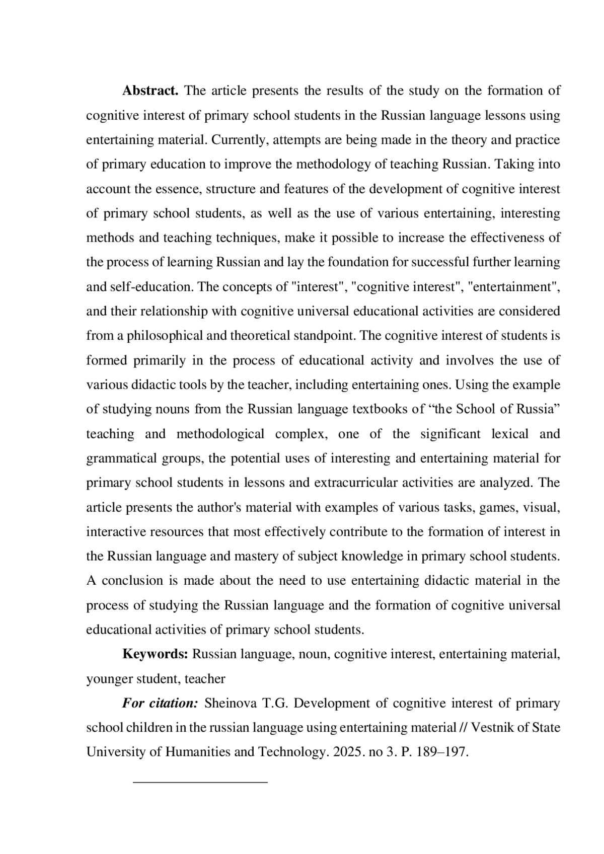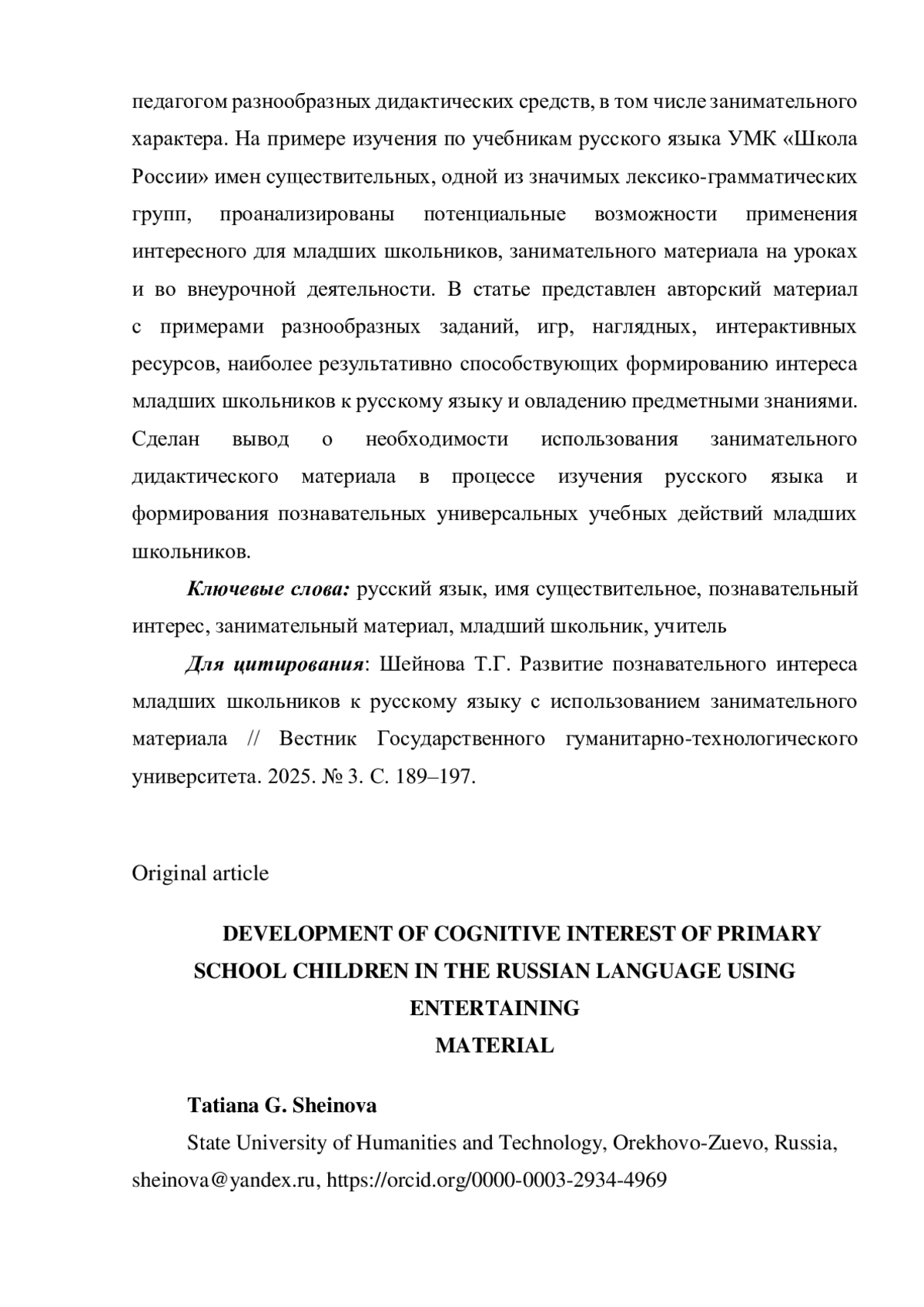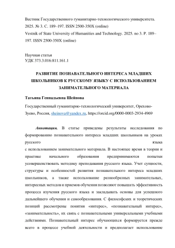 ШЕЙНОВА Т. Г. РАЗВИТИЕ ПОЗНАВАТЕЛЬНОГО ИНТЕРЕСА МЛАДШИХ ШКОЛЬНИКОВ К РУССКОМУ ЯЗЫКУ С ИСПОЛЬЗОВАНИЕМ ЗАНИМАТЕЛЬНОГО МАТЕРИАЛА // ВЕСТНИК ГОСУДАРСТВЕННОГО ГУМАНИТАРНО-ТЕХНОЛОГИЧЕСКОГО УНИВЕРСИТЕТА. 2025. № 3