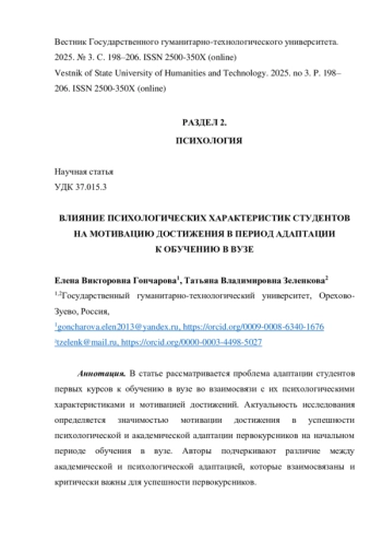 3. Гончарова Е.В., Зеленкова Т.В. Психологические корреляты агрессивности студентов-первокурсников в период адаптации к обучению в вузе // Вестник Государственного гуманитарно-технологического университета. 2025. № 2. С. 153-160. EDN: LTCBZC