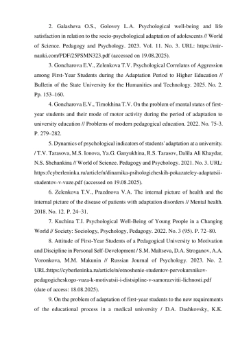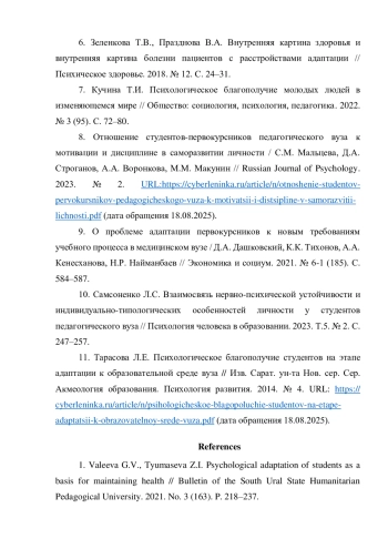 11. Тарасова Л.Е. Психологическое благополучие студентов на этапе адаптации к образовательной среде вуза / Изв. Сарат. ун-та Нов. сер. Сер. Акмеология образования. Психология развития. 2014. № 4. URL: https://cyberleninka.ru/article/n/psihologicheskoe-blagopoluchie-studentov-na-etape-adaptatsii-k-obrazovatelnoy-srede-vuza.pdf (дата обращения 18.08.2025).