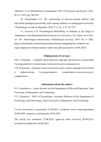 4. Гончарова Е.В., Тимохина Т.В. К проблеме психических состояний студентов первого курса и режима их двигательной активности в период адаптации к университетскому обучению // Проблемы современного педагогического образования. 2022. № 75-3. С. 279-282. EDN: OHVSIC