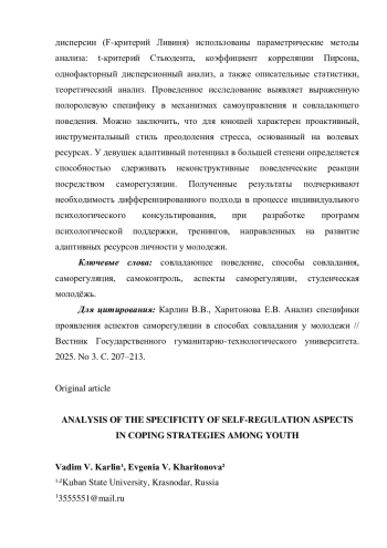 В статье представлены результаты анализа специфики проявления аспектов саморегуляции в способах совладания у молодёжи. В результате теоретического анализа проблемы саморегуляции у молодых людей была выявлена её особая роль для совладающего поведения. Выявлено, что саморегуляция, согласно различным исследованиям, по существу, может выступать с одной стороны в качестве медиатора для адаптивных стратегий совладания, а с другой, быть условием для мобилизации ресурсов личности, а также являться таковым в процессе совладания. Также теоретический анализ показал, что её недостаточное развитие в период юности может способствовать возникновению у личности неадаптивного поведения и преобладанию различных защитных механизмов. Исходя из этого, обнаруженные особенности послужили причинами для исследования специфики отдельных аспектов саморегуляции в способах совладания. В связи с однородностью дисперсии (F-критерий Ливиня) использованы параметрические методы анализа: t-критерий Стьюдента, коэффициент корреляции Пирсона, однофакторный дисперсионный анализ, а также описательные статистики, теоретический анализ. Проведенное исследование выявляет выраженную полоролевую специфику в механизмах самоуправления и совладающего поведения. Можно заключить, что для юношей характерен проактивный, инструментальный стиль преодоления стресса, основанный на волевых ресурсах. У девушек адаптивный потенциал в большей степени определяется способностью сдерживать неконструктивные поведенческие реакции посредством саморегуляции. Полученные результаты подчеркивают необходимость дифференцированного подхода в процессе индивидуального психологического консультирования, при разработке программ психологической поддержки, тренингов, направленных на развитие адаптивных ресурсов личности у молодежи.