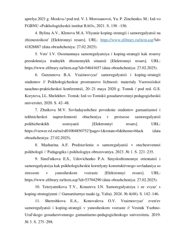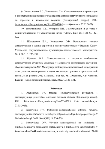 9. Синельникова Е.С., Удовиченко П.А. Смысложизненные ориентации и саморегуляция как психологические корреляты конструктивного совладания со стрессом в юношеском возрасте [Электронный ресурс]. URL: https://www.elibrary.ru/item.asp?id=53704290(датаобращения:27.02.2025).