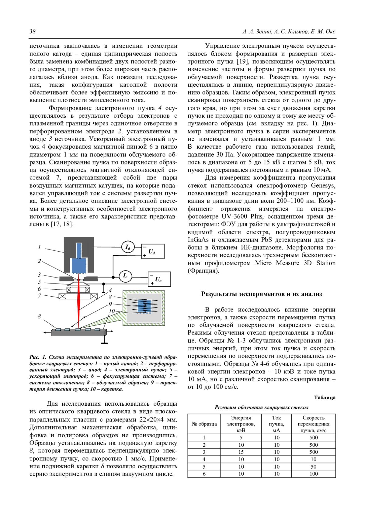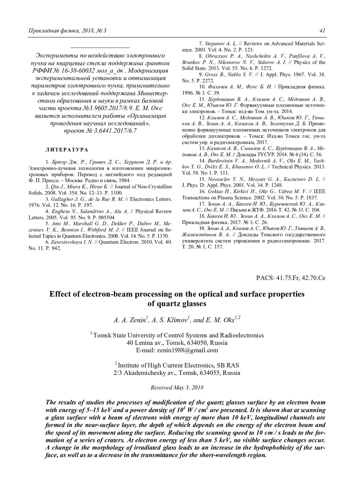 ЗЕНИН А. А., КЛИМОВ А. С., ОКС Е. ВЛИЯНИЕ ЭЛЕКТРОННО-ЛУЧЕВОЙ ОБРАБОТКИ НА ОПТИЧЕСКИЕ И ПОВЕРХНОСТНЫЕ СВОЙСТВА КВАРЦЕВЫХ СТЕКОЛ // ПРИКЛАДНАЯ ФИЗИКА. 2018. №3