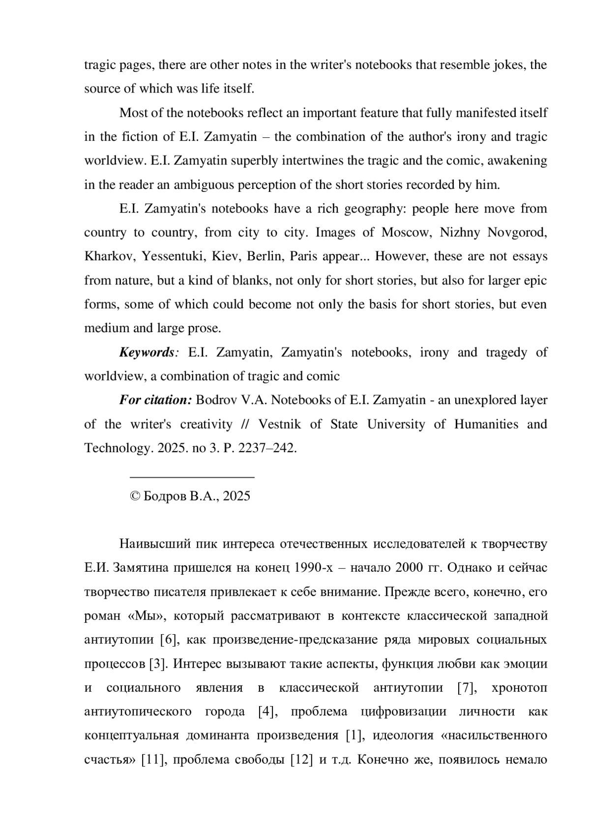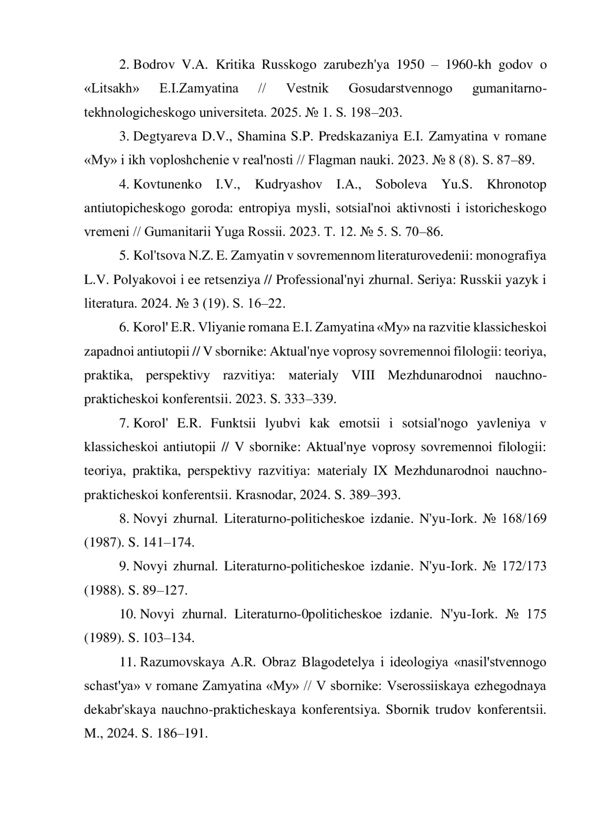 2. Бодров В.А. Критика Русского зарубежья 1950 - 1960-х годов о “Лицах” Е.И. Замятина // Вестник Государственного гуманитарно-технологического университета. 2025. № 1. С. 198-203. EDN: CBWXDQ