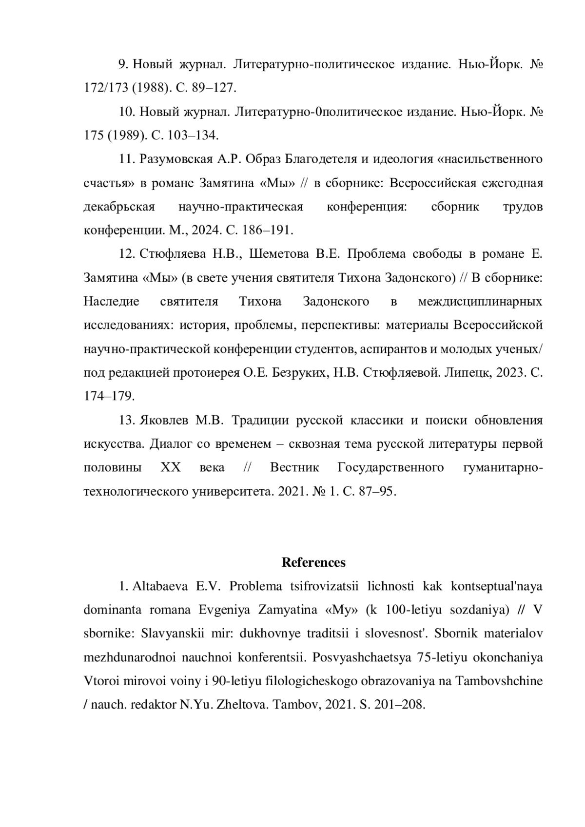 1. Алтабаева Е.В. Проблема цифровизации личности как концептуальная доминанта романа Евгения Замятина “Мы” (к 100-летию создания) // Славянский мир: духовные традиции и словесность: сборник материалов международной научной конференции. Посвящается 75-летию окончания Второй мировой войны и 90-летию филологического образования на Тамбовщине / науч. ред. Н.Ю. Желтова. Тамбов, 2021. С. 201-208. EDN: JMKYZO