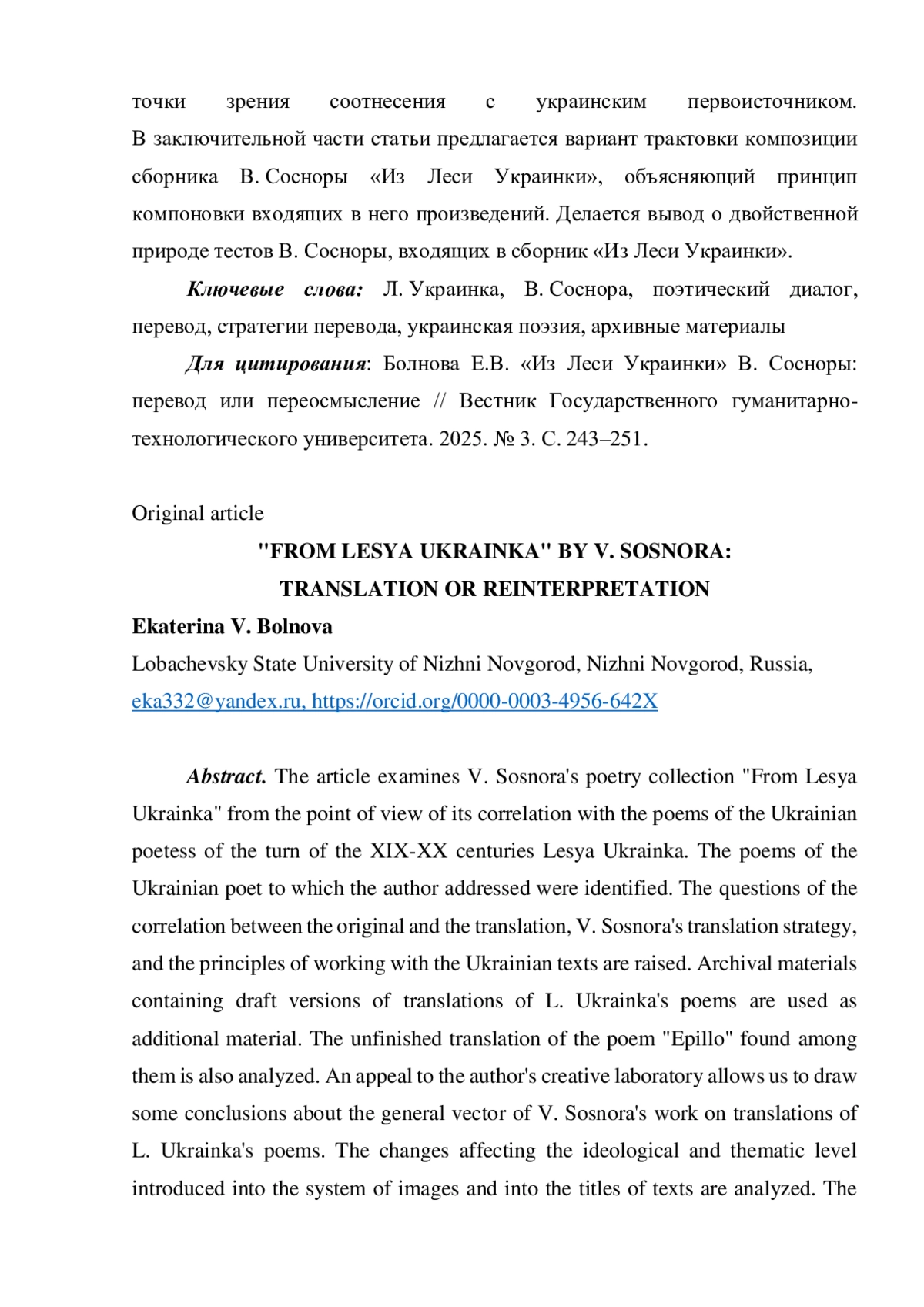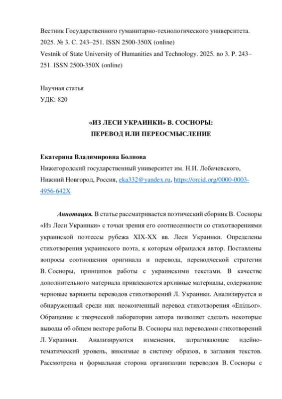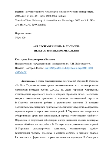 В статье рассматривается поэтический сборник В. Сосноры «Из Леси Украинки» с точки зрения его соотнесенности со стихотворениями украинской поэтессы рубежа XIX-XX вв. Леси Украинки. Определены стихотворения украинского поэта, к которым обращался автор. Поставлены вопросы соотношения оригинала и перевода, переводческой стратегии В. Сосноры, принципов работы с украинскими текстами. В качестве дополнительного материала привлекаются архивные материалы, содержащие черновые варианты переводов стихотворений Л. Украинки. Анализируется и обнаруженный среди них неоконченный перевод стихотворения «Епільоґ». Обращение к творческой лаборатории автора позволяет сделать некоторые выводы об общем векторе работы В. Сосноры над переводами стихотворений Л. Украинки. Анализируются изменения, затрагивающие идейно-тематический уровень, вносимые в систему образов, в заглавия текстов. Рассмотрена и формальная сторона организации переводов В. Сосноры с точки зрения соотнесения с украинским первоисточником. В заключительной части статьи предлагается вариант трактовки композиции сборника В. Сосноры «Из Леси Украинки», объясняющий принцип компоновки входящих в него произведений. Делается вывод о двойственной природе тестов В. Сосноры, входящих в сборник «Из Леси Украинки».
