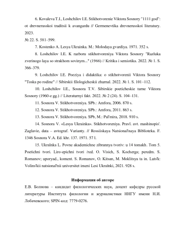 6. Ковалева Т.И., Лощилов И.Е. Стихотворение Виктора Сосноры “1111 год”: от древнерусской традиции к авангарду // Герменевтика древнерусской литературы. 2023. № 22. С. 581-599. EDN: RFQIPF