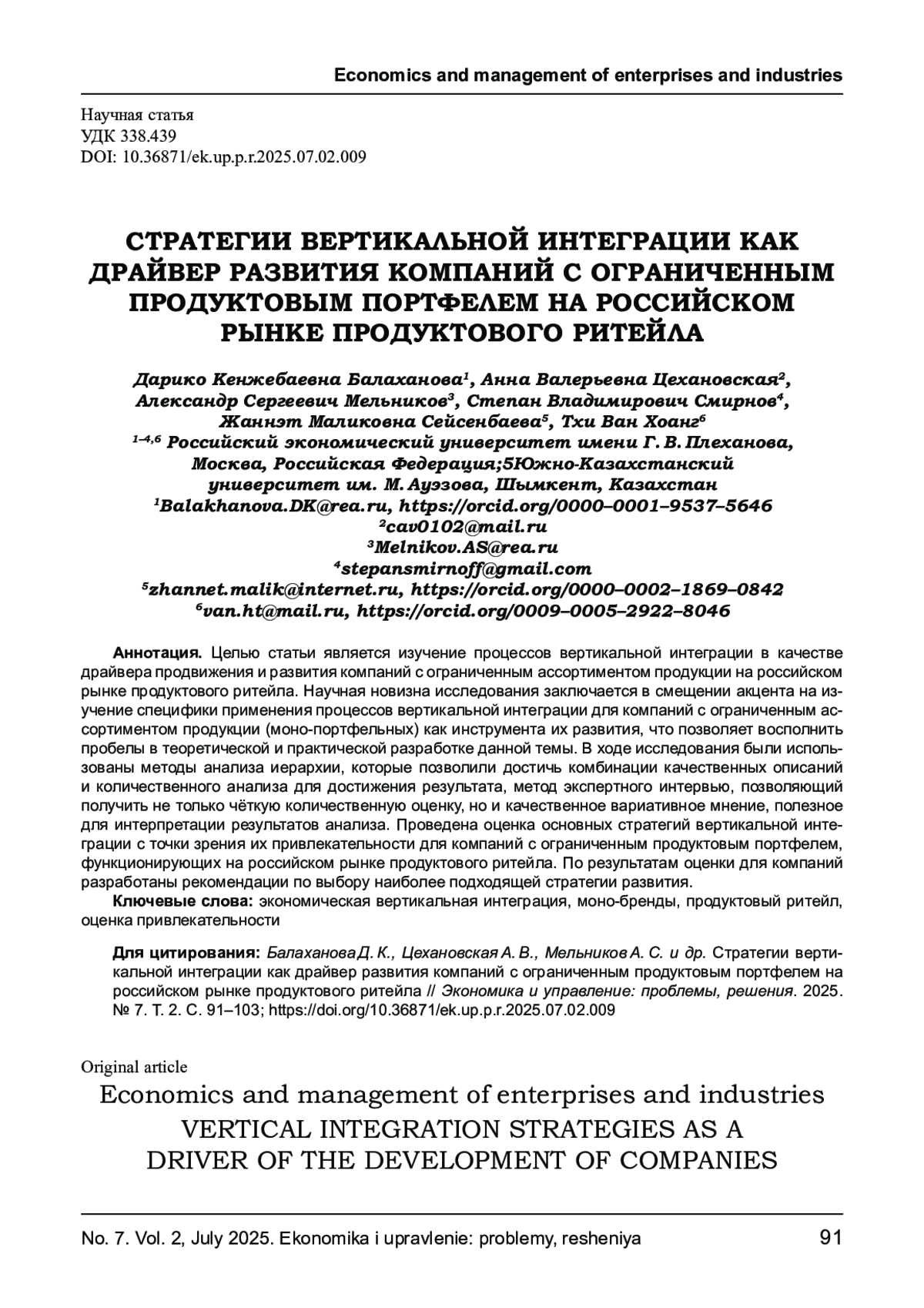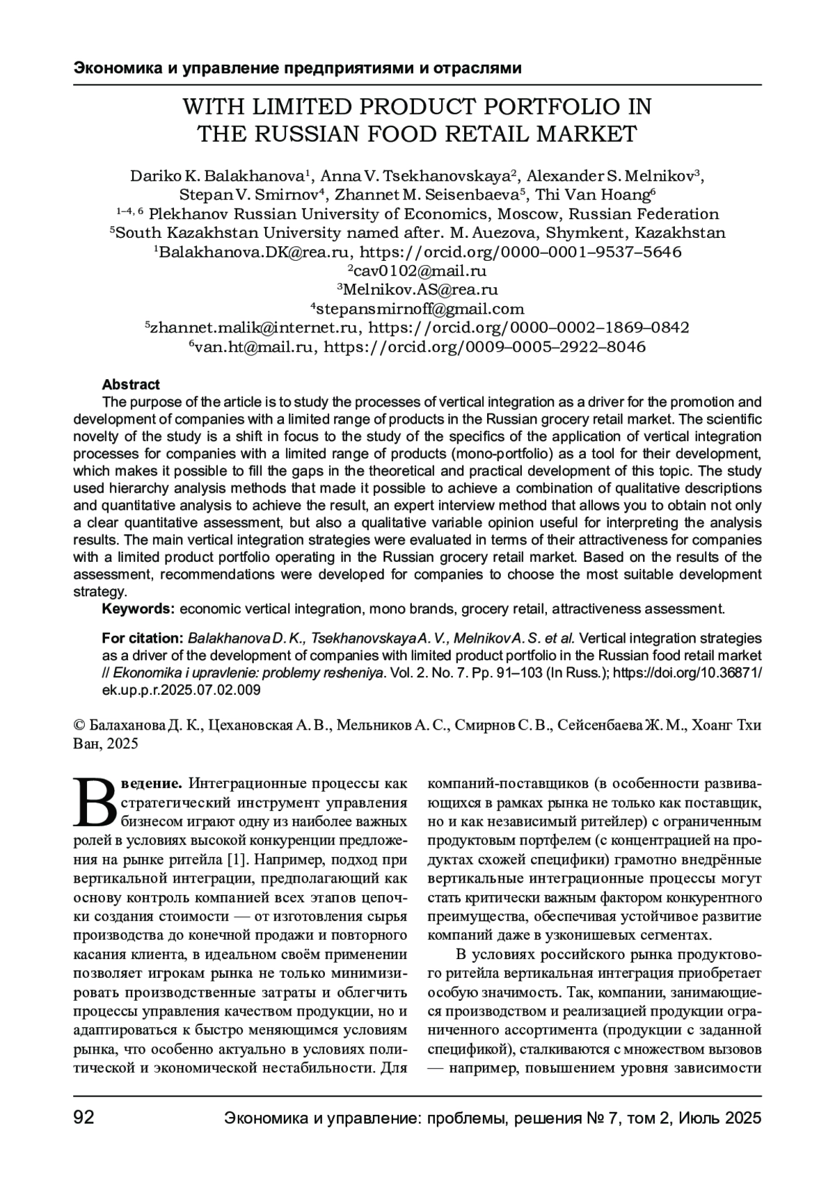 Целью статьи является изучение процессов вертикальной интеграции в качестве драйвера продвижения и развития компаний с ограниченным ассортиментом продукции на российском рынке продуктового ритейла. Научная новизна исследования заключается в смещении акцента на изучение специфики применения процессов вертикальной интеграции для компаний с ограниченным ассортиментом продукции (моно-портфельных) как инструмента их развития, что позволяет восполнить пробелы в теоретической и практической разработке данной темы. В ходе исследования были использованы методы анализа иерархии, которые позволили достичь комбинации качественных описаний и количественного анализа для достижения результата, метод экспертного интервью, позволяющий получить не только чёткую количественную оценку, но и качественное вариативное мнение, полезное для интерпретации результатов анализа. Проведена оценка основных стратегий вертикальной интеграции с точки зрения их привлекательности для компаний с ограниченным продуктовым портфелем, функционирующих на российском рынке продуктового ритейла. По результатам оценки для компаний разработаны рекомендации по выбору наиболее подходящей стратегии развития.