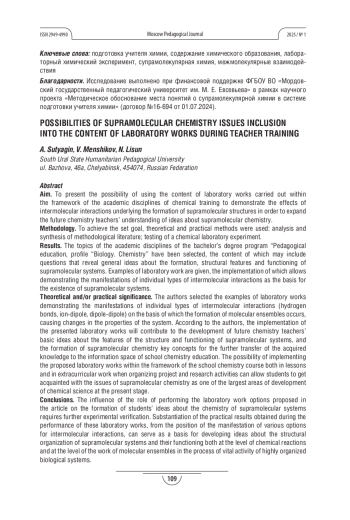 Теоретическая и/или практическая значимость. Отобраны примеры лабораторных работ, демонстрирующих проявления отдельных видов межмолекулярных взаимодействий (водородные связи, ион-дипольные, диполь-дипольные), на основе которых происходит формирование молекулярных ансамблей, обуславливающее изменения свойств системы. По мнению авторов, выполнение представленных лабораторных работ будет способствовать развитию у будущих учителей химии базовых представлений об особенностях строения и функционирования супрамолекулярных систем и формированию ключевых понятий супрамолекулярной химии для дальнейшего переноса полученных знаний в информационное пространство школьного химического образования. Возможность реализации предложенных лабораторных работ в рамках школьного курса химии как на уроках, так и во внеурочной работе при организации проектной и исследовательской деятельности, может позволить обучающимся ознакомиться с вопросами супрамолекулярной химии, как одного из крупнейших направлений развития химической науки на современном этапе.