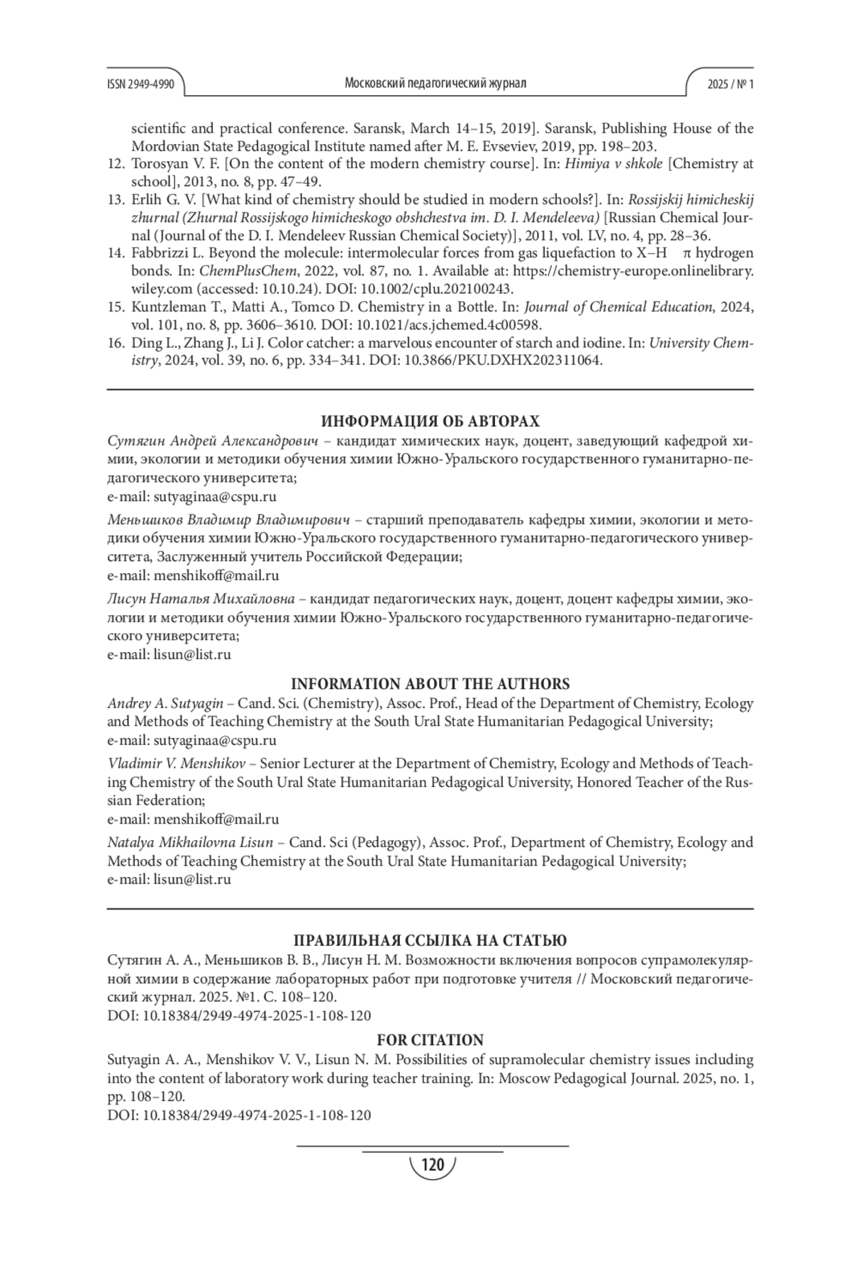 11. Сутягин А. А., Меньшиков В. В. Изучение понятий супрамолекулярной химии при подготовке будущих учителей // Актуальные проблемы естественно-технологического образования: сборник научных трудов по материалам Международной научно-практической конференции. Саранск, 14-15 марта 2019 г. / под ред. М. В. Лабутиной, Т. А. Маскаевой, В. В. Панькиной. Саранск: Издательство Мордовского государственного педагогического института имени М. Е. Евсевьева, 2019. С. 198-203. EDN: KJDMHD