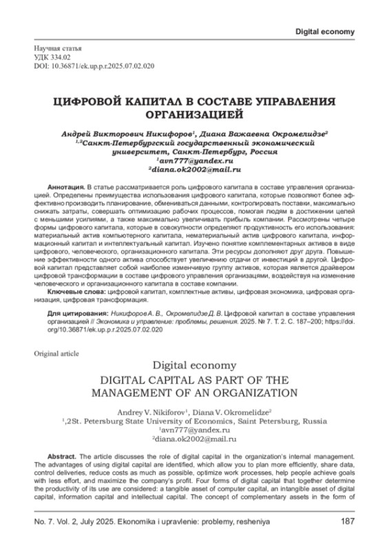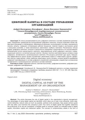 В статье рассматривается роль цифрового капитала в составе управления организацией. Определены преимущества использования цифрового капитала, которые позволяют более эффективно производить планирование, обмениваться данными, контролировать поставки, максимально снижать затраты, совершать оптимизацию рабочих процессов, помогая людям в достижении целей с меньшими усилиями, а также максимально увеличивать прибыль компании. Рассмотрены четыре формы цифрового капитала, которые в совокупности определяют продуктивность его использования: материальный актив компьютерного капитала, нематериальный актив цифрового капитала, информационный капитал и интеллектуальный капитал. Изучено понятие комплементарных активов в виде цифрового, человеческого, организационного капитала. Эти ресурсы дополняют друг друга. Повышение эффективности одного актива способствует увеличению отдачи от инвестиций в другой. Цифровой капитал представляет собой наиболее изменчивую группу активов, которая является драйвером цифровой трансформации в составе цифрового управления организациями, воздействуя на изменение человеческого и организационного капитала в составе компании.