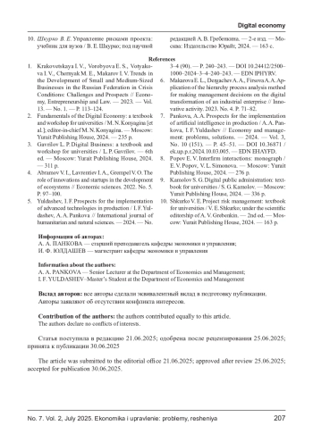 7. Панкова, А. А. Перспективы внедрения искусственного интеллекта в производстве / А. А. Панкова, И. Ф. Юлдашев // Экономика и управление: проблемы, решения. - 2024. - Т. 3, № 10(151). - С. 45-51. 10.36871/ ek.up.p.r.2024.10.03.005. DOI: 10.36871/ek.up.p.r.2024.10.03.005 EDN: EHAYFD