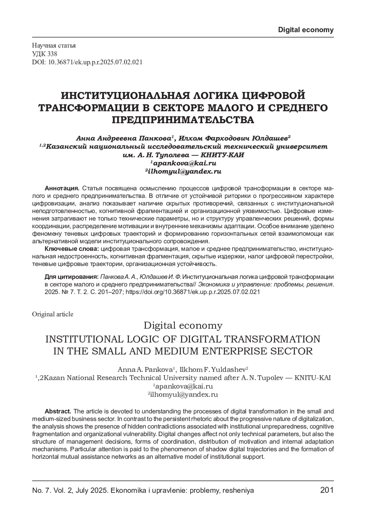 Статья посвящена осмыслению процессов цифровой трансформации в секторе малого и среднего предпринимательства. В отличие от устойчивой риторики о прогрессивном характере цифровизации, анализ показывает наличие скрытых противоречий, связанных с институциональной неподготовленностью, когнитивной фрагментацией и организационной уязвимостью. Цифровые изменения затрагивают не только технические параметры, но и структуру управленческих решений, формы координации, распределение мотивации и внутренние механизмы адаптации. Особое внимание уделено феномену теневых цифровых траекторий и формированию горизонтальных сетей взаимопомощи как альтернативной модели институционального сопровождения.