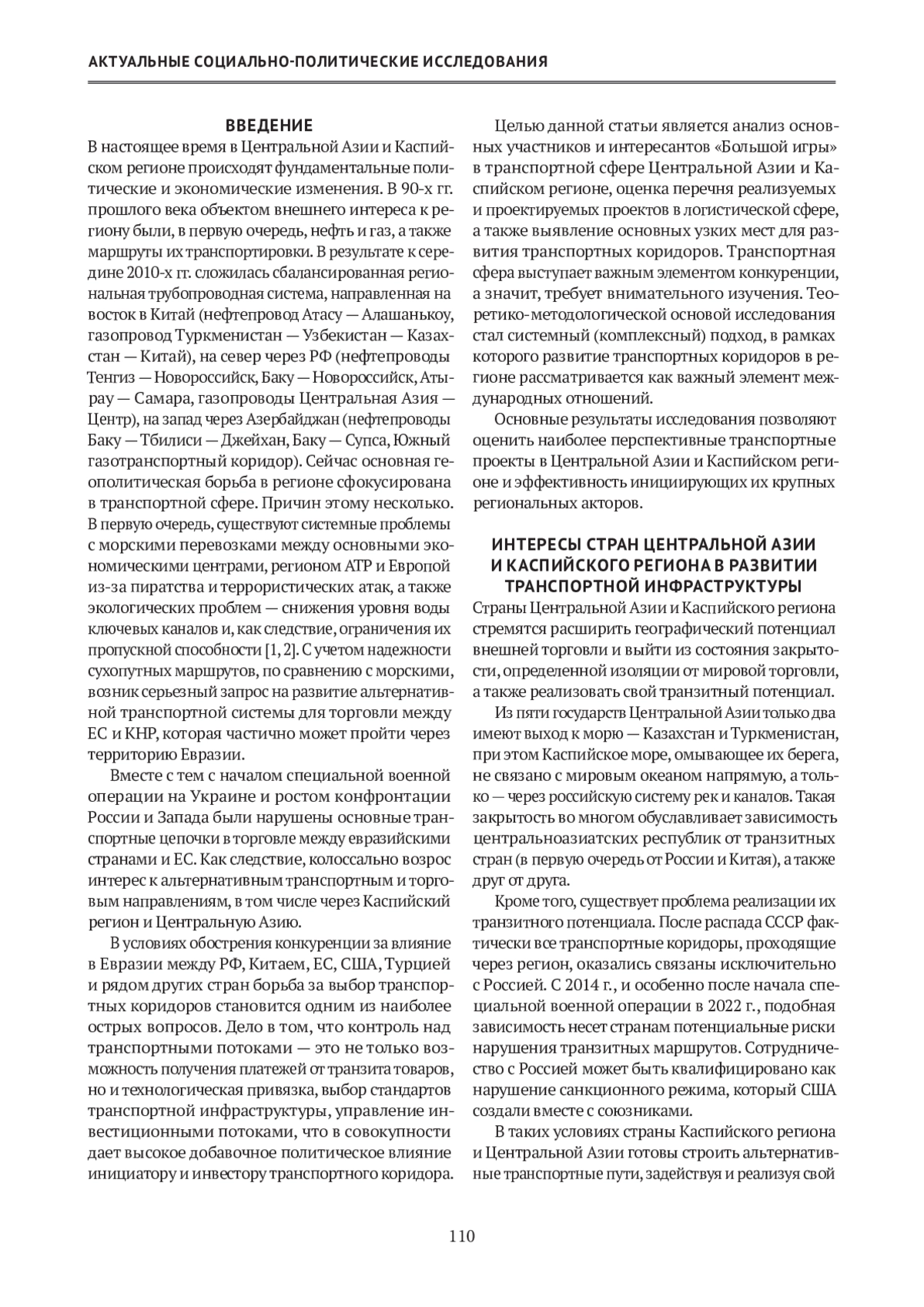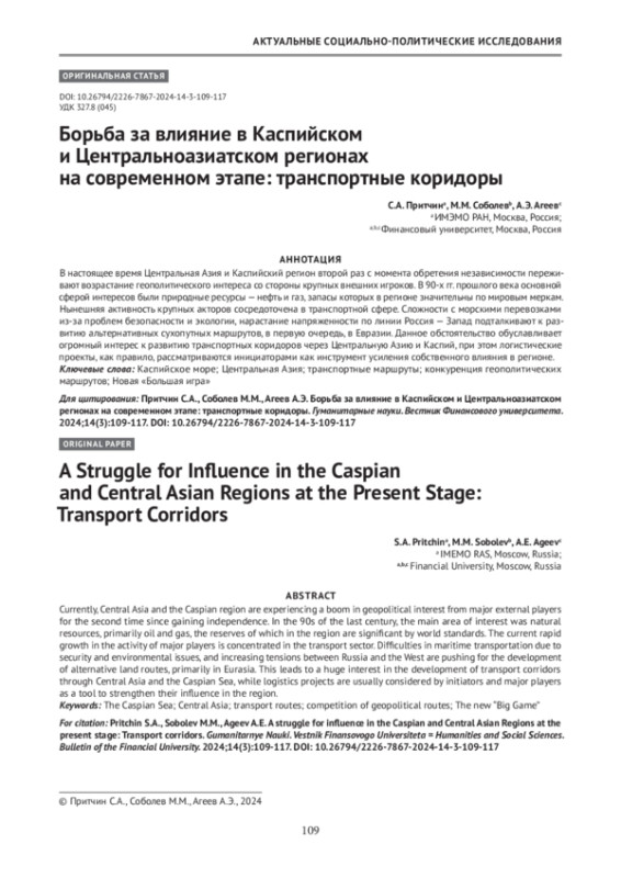 В настоящее время Центральная Азия и Каспийский регион второй раз с момента обретения независимости переживают возрастание геополитического интереса со стороны крупных внешних игроков. В 90-х гг. прошлого века основной сферой интересов были природные ресурсы — н ефть и газ, запасы которых в регионе значительны по мировым меркам. Нынешняя активность крупных акторов сосредоточена в транспортной сфере. Сложности с морскими перевозками из-за проблем безопасности и экологии, нарастание напряженности по линии Россия — Запад подталкивают к развитию альтернативных сухопутных маршрутов, в первую очередь, в Евразии. Данное обстоятельство обуславливает огромный интерес к развитию транспортных коридоров через Центральную Азию и Каспий, при этом логистические проекты, как правило, рассматриваются инициаторами как инструмент усиления собственного влияния в регионе.