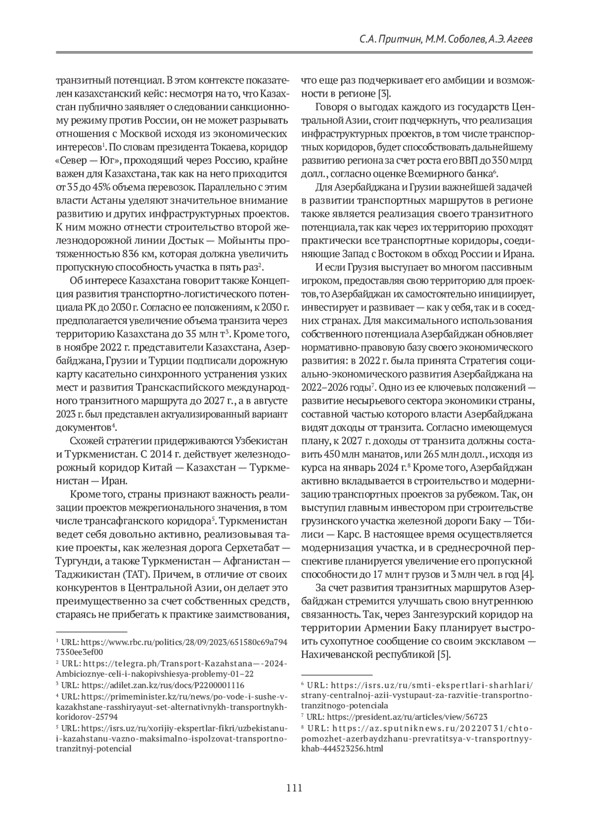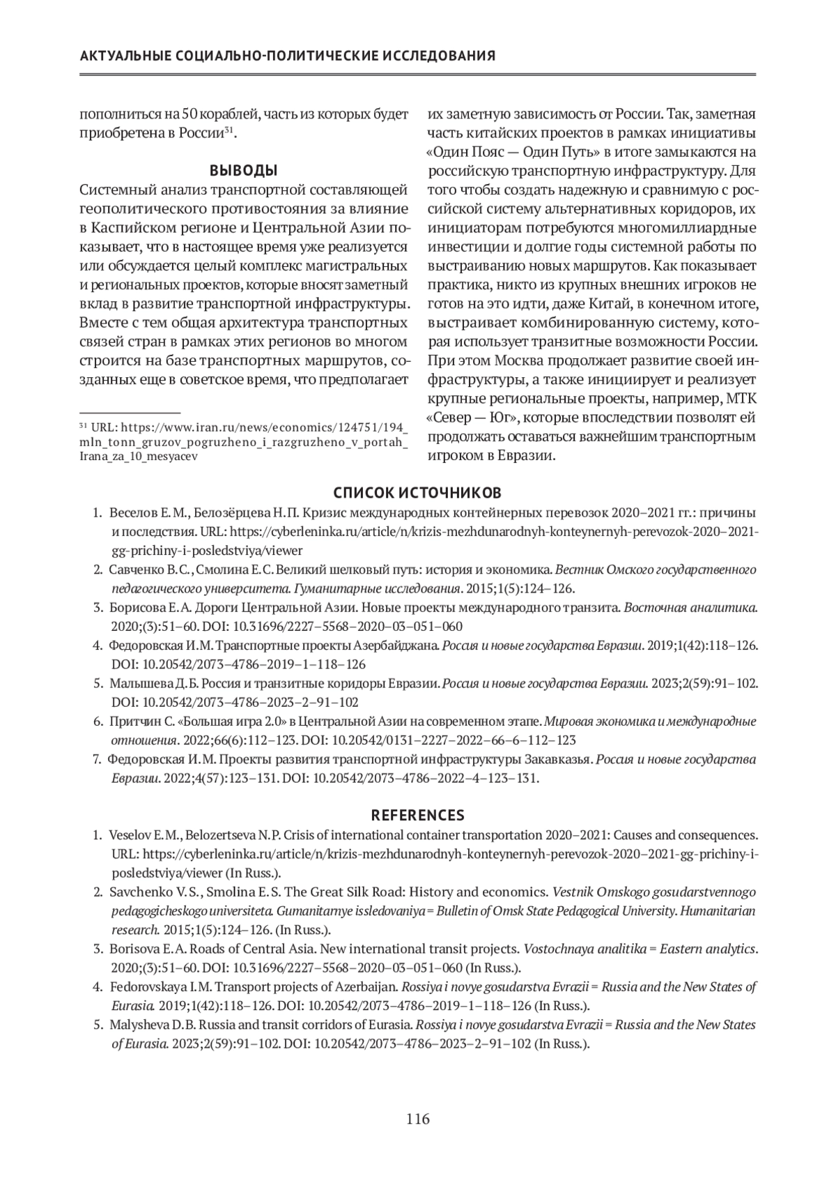 5. Малышева Д. Б. Россия и транзитные коридоры Евразии. Россия и новые государства Евразии. 2023;2(59):91-102. https://doi.org/10.20542/2073-4786-2023-2-91-102