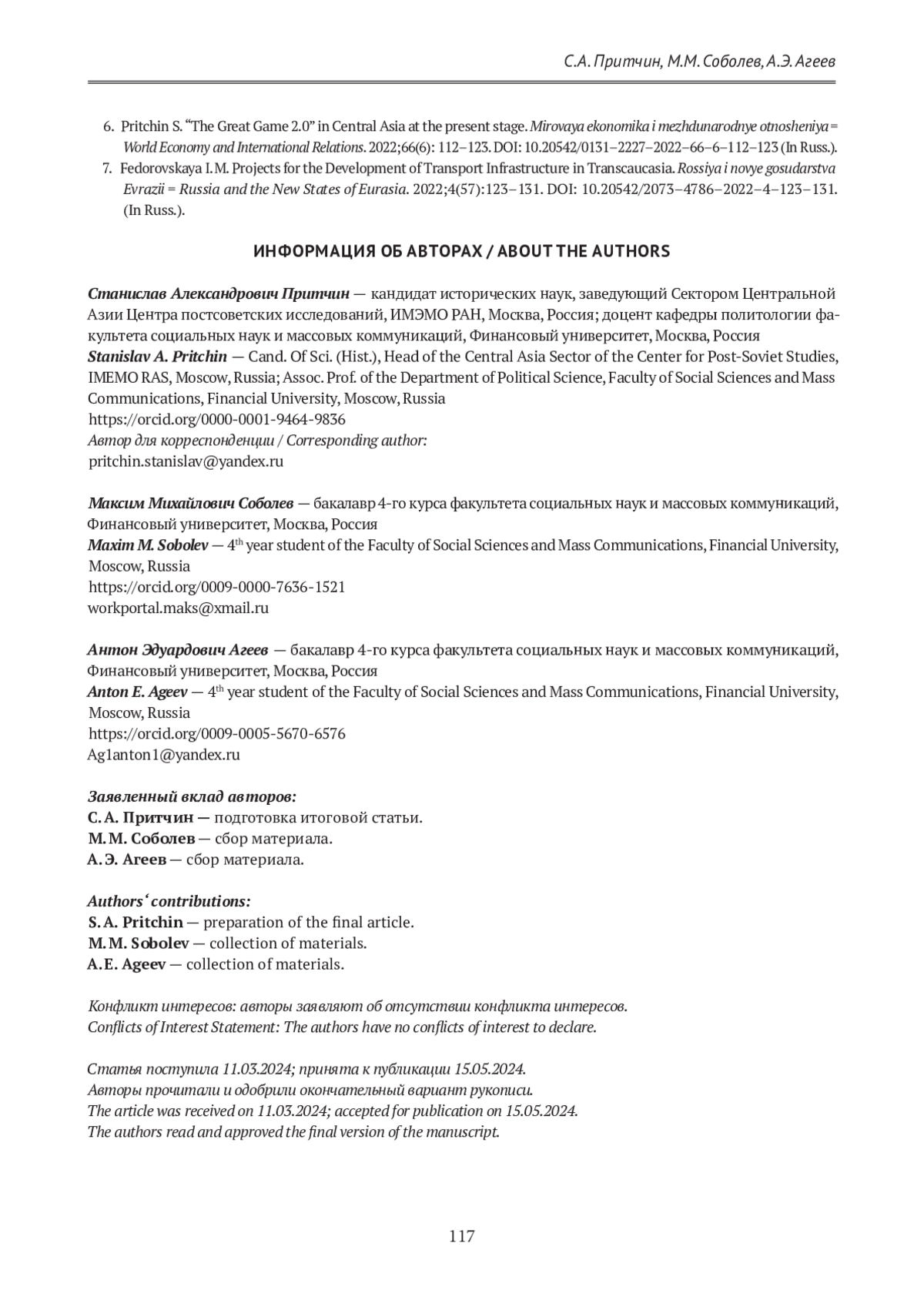 6. Притчин С. «Большая игра 2.0» в Центральной Азии на современном этапе. Мировая экономика и международные отношения. 2022;66(6):112-123. https://doi.org/10.20542/0131-2227-2022-66-6-112-123