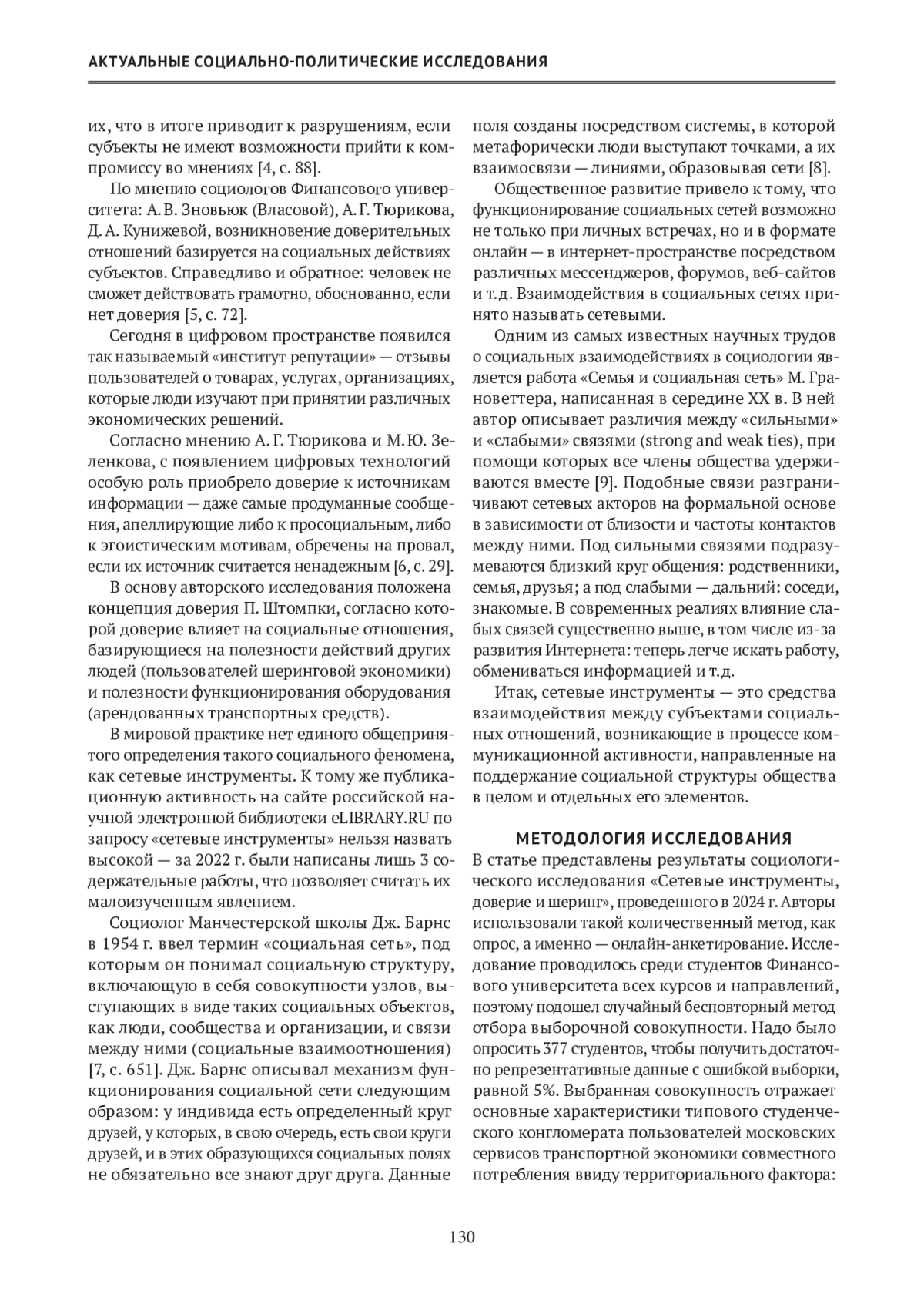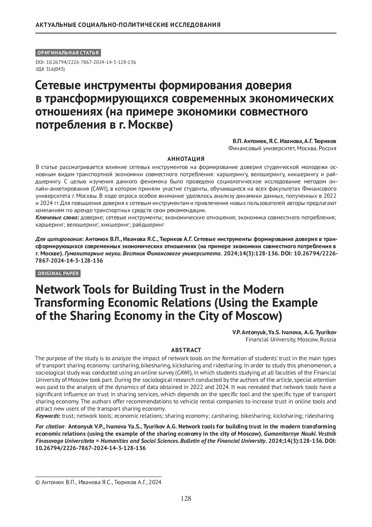 Статья: Сетевые инструменты формирования доверия в трансформирующихся современных экономических отношениях (на примере экономики совместного потребления в г. Москве) (2024)
