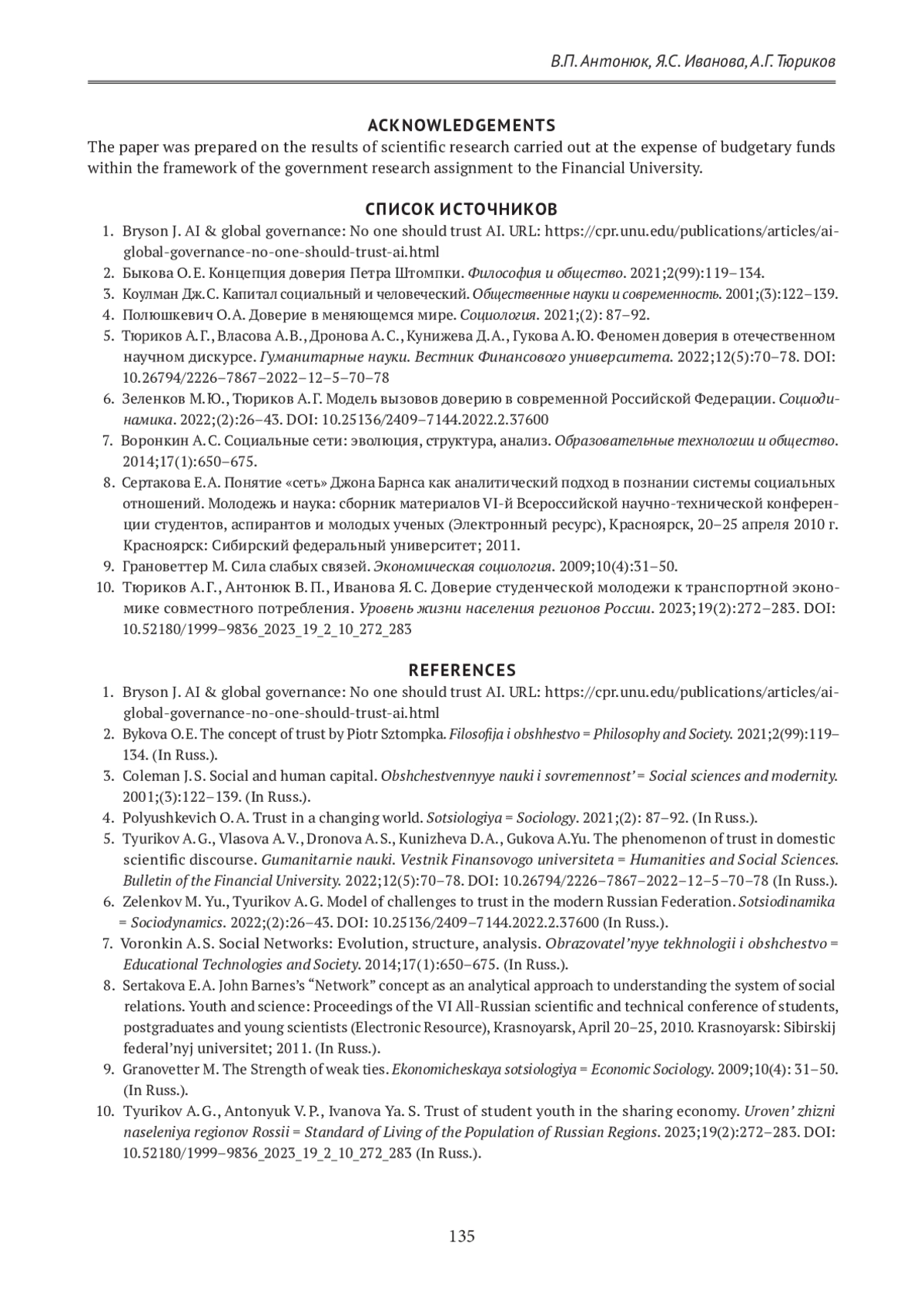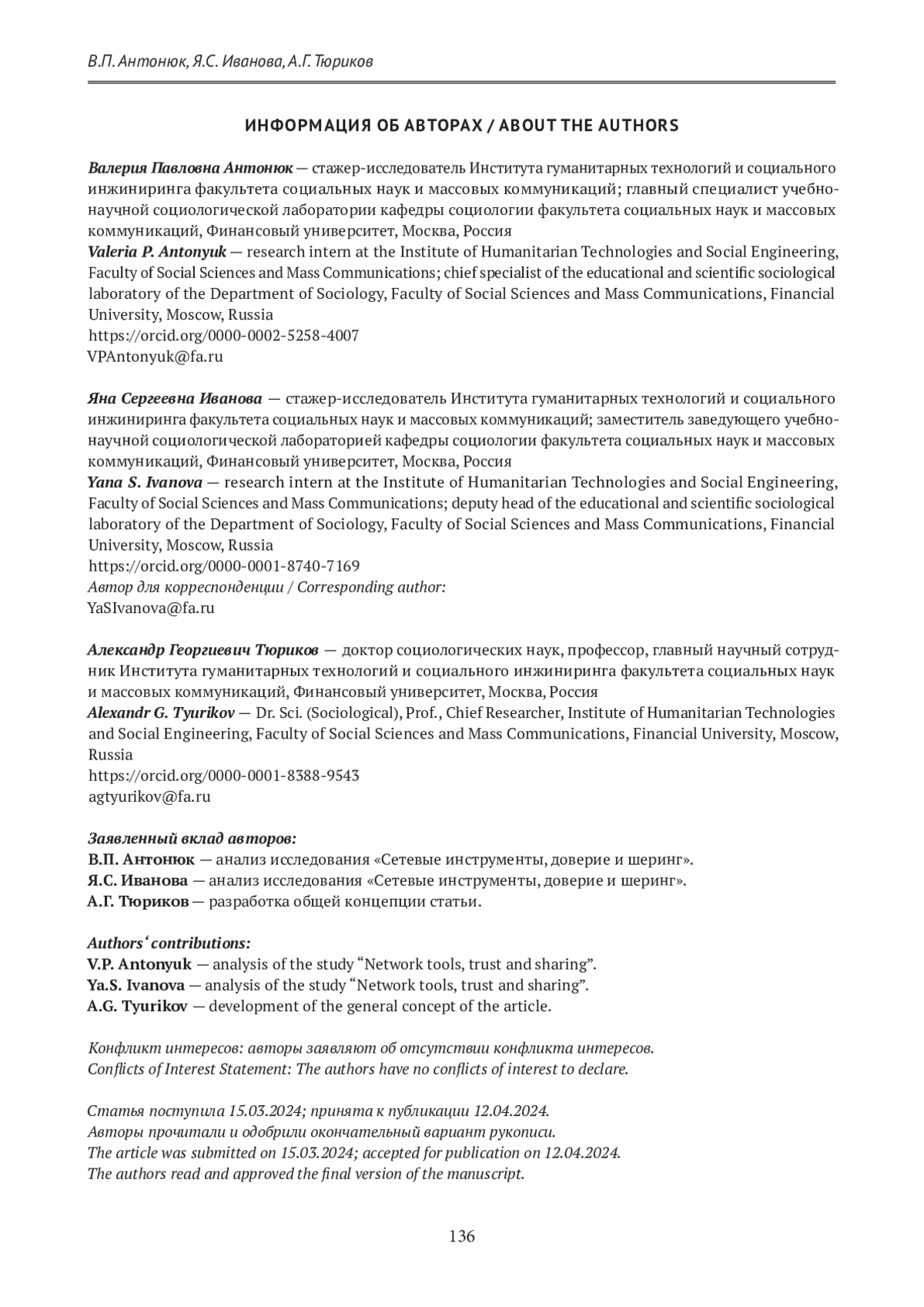 АНТОНЮК В. П., ИВАНОВА Я. С., ТЮРИКОВ А. Г. СЕТЕВЫЕ ИНСТРУМЕНТЫ ФОРМИРОВАНИЯ ДОВЕРИЯ В ТРАНСФОРМИРУЮЩИХСЯ СОВРЕМЕННЫХ ЭКОНОМИЧЕСКИХ ОТНОШЕНИЯХ (НА ПРИМЕРЕ ЭКОНОМИКИ СОВМЕСТНОГО ПОТРЕБЛЕНИЯ В Г. МОСКВЕ) // ГУМАНИТАРНЫЕ НАУКИ. ВЕСТНИК ФИНАНСОВОГО УНИВЕРСИТЕТА. 2024. ТОМ 14, № 3