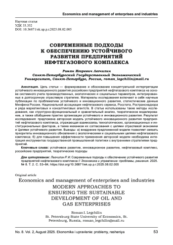 Цель статьи - формирование и обоснование концептуальной интерпретации устойчивого инновационного развития российских предприятий нефтегазового комплекса на основе системного учета производственных, экологических и социальных параметров, интегрированных в долгосрочную отраслевую стратегию. Материалы исследования включают в себя научные публикации по проблематике устойчивого и инновационного развития, статистические данные Минфина России, Национальной ассоциации нефтегазового сервиса, Росстата, Ространснадзора и ряда маркетинговых и консалтинговых агентств. В статье использованы такие методы исследования, как структурно- функциональный и сравнительный анализ, теоретическое моделирование, а также обобщение практик организации устойчивого и инновационного развития. Результат исследования: предложена авторская модель устойчивого инновационного развития предприятий нефтегазового комплекса, отражающая взаимосвязь технологических, организационных и институциональных факторов, а также механизм их согласования с целями отраслевой экономики и Целями устойчивого развития.