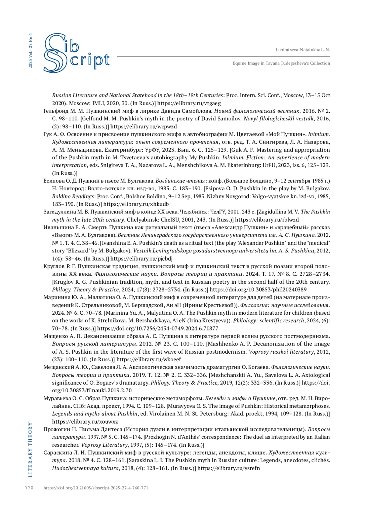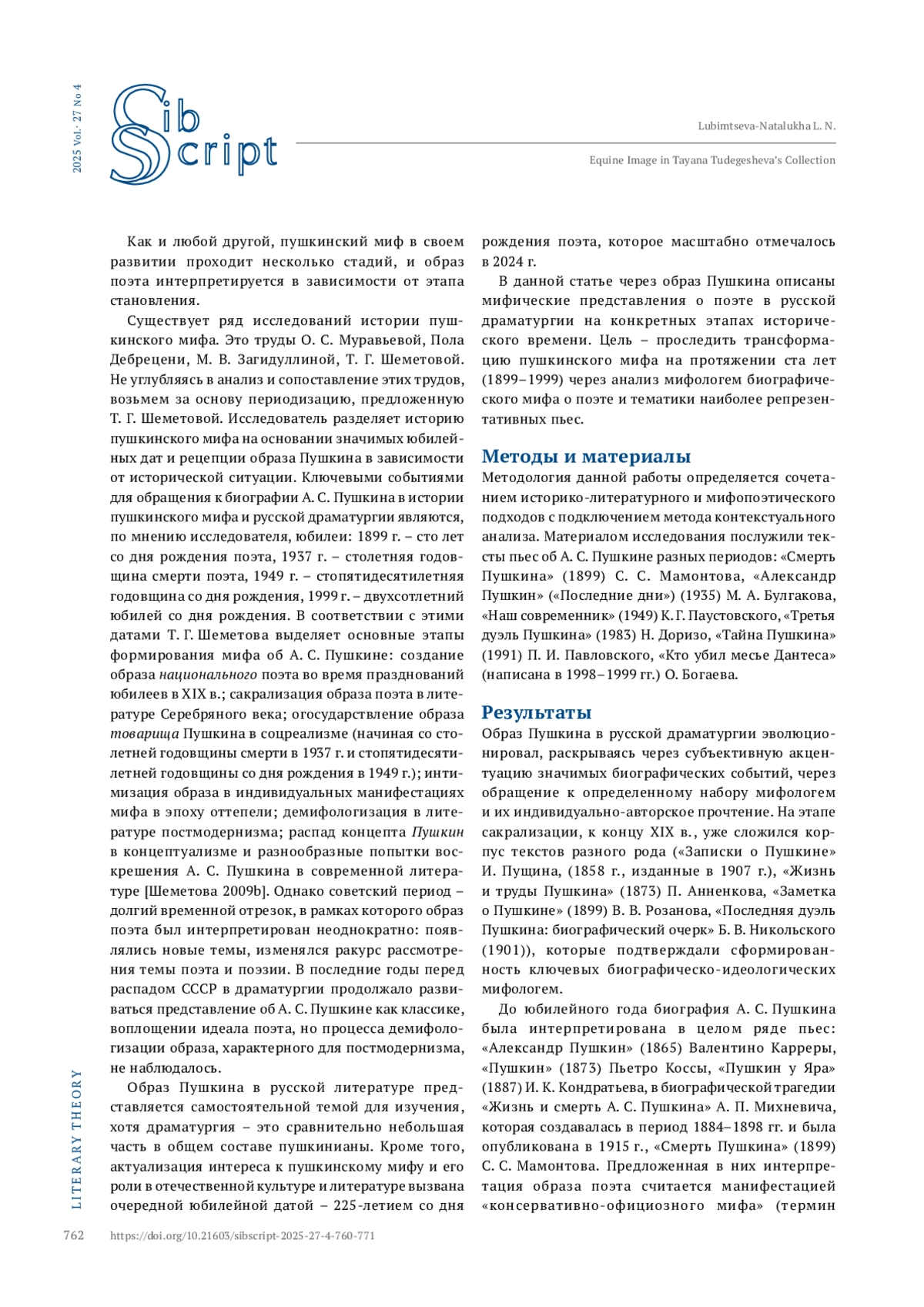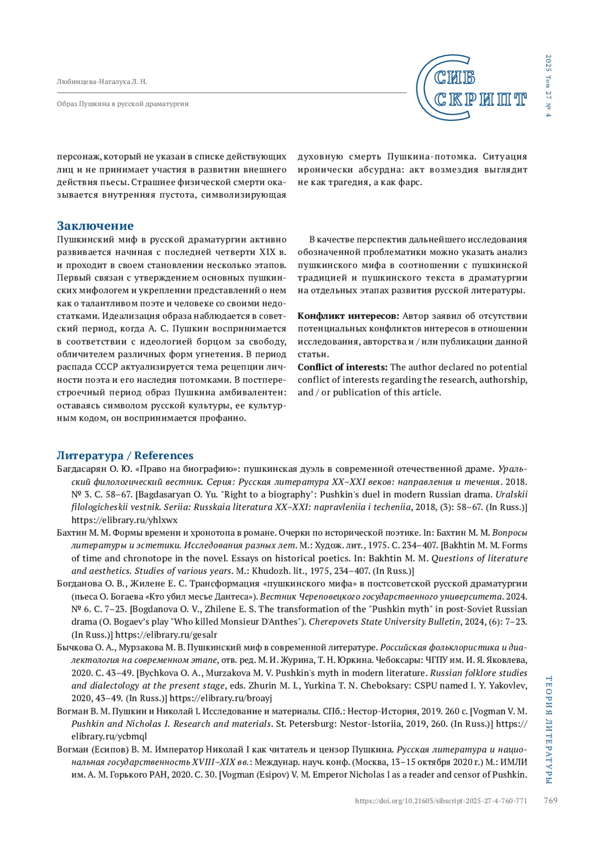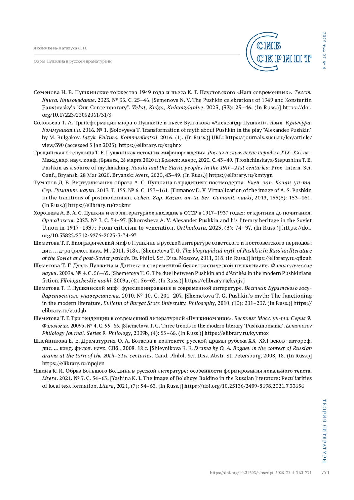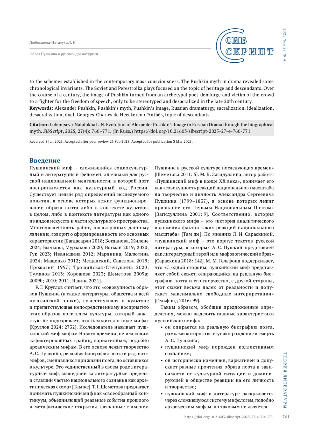 ЛЮБИМЦЕВА-НАТАЛУХА Л. Н. ОБРАЗ ПУШКИНА В РУССКОЙ ДРАМАТУРГИИ НА ОТДЕЛЬНЫХ ЭТАПАХ РАЗВИТИЯ БИОГРАФИЧЕСКОГО МИФА // СИБСКРИПТ. 2025. Т. 27, № 4