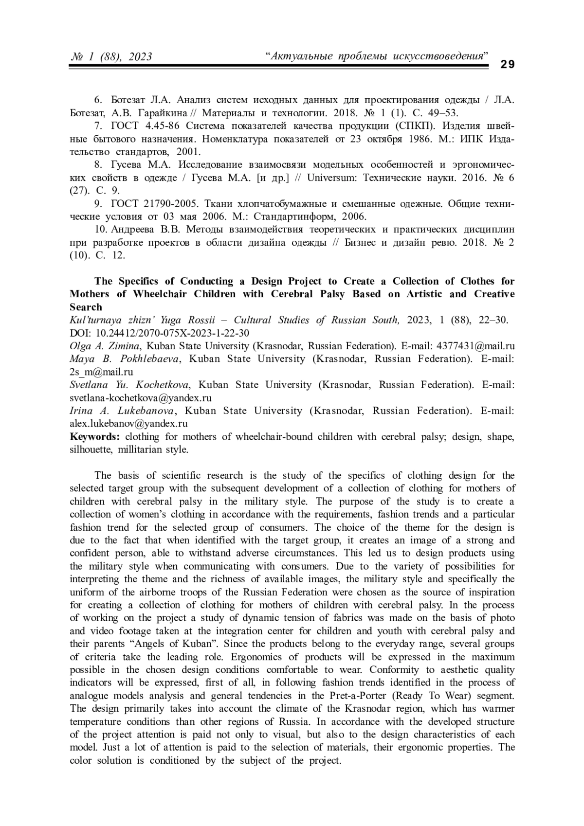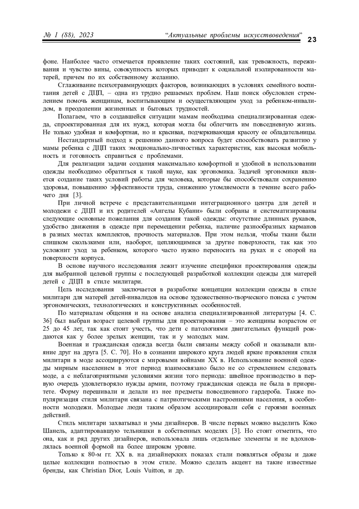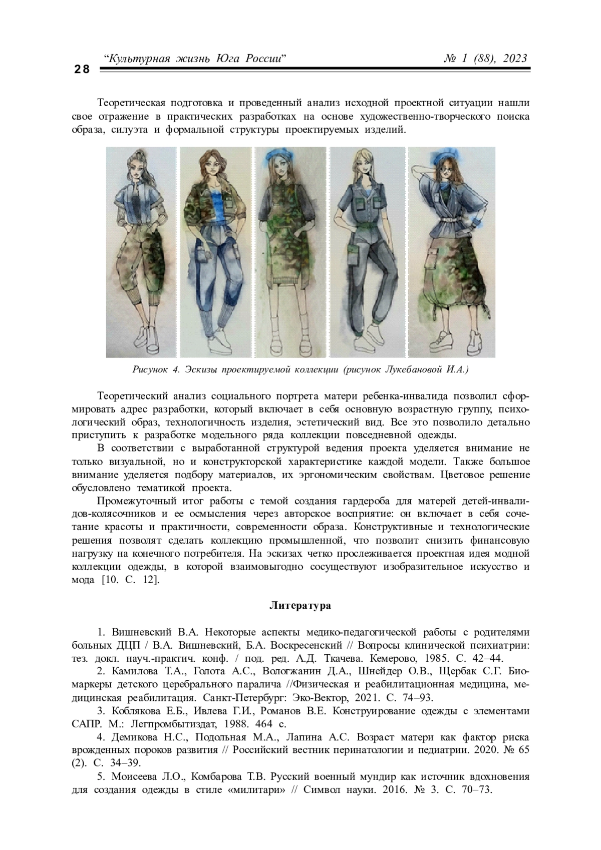 В основе научного исследования лежит изучение специфики проектирования одежды для выбранной целевой группы с последующей разработкой коллекции одежды для матерей детей с ДЦП в стиле милитари. Собраны и систематизированы основные пожелания для создания одежды на основе работы с целевой группой. Показан процесс анализа силуэтных форм современных коллекций известных брендов. Нашли свое отражение концептуальные и визуализированные промежуточные результаты создания художественного проекта с учетом указанных обстоятельств