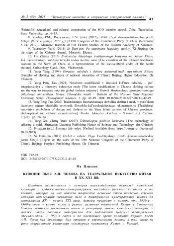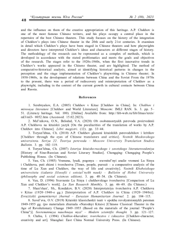 Введение. В Китае одним из самых популярных российских писателей и драматургов является А. П. Чехов. Его творчество играет большую роль в развитии русско-китайских культурных связей, а его изучение в призме рассмотрения культуры Поднебесной и ее диалога с Россией стало актуальной темой исследований ученых в обеих странах. Российские исследователи в последние годы преимущественно интересуются особенностями переводов и интерпретацией текстов Чехова. Например, О. Н. Мельникова и В. А. Белодед выявили и охарактеризовали лингвистические особенности переводов произведений А. П. Чехова на китайский язык на примере пьесы «Дядя Ваня». К изучению влияния произведений русского писателя на китайскую культуру обращались Е. А. Серебряков, Цуй Юньюнь, Ши Шаньшань, Б. В. Кондаков и др. Специфику постановок пьес русского драматурга в Китае рассматривал в диссертации Лю Цзякун. Цинь Дань и Ян Хайбинь сравнили пьесы А. П. Чехова с традициями китайской драмы. Проблемам восприятия драматургии А. П. Чехова в китайской критике и литературоведении XX века посвящали диссертации на русском языке Шэн Хайтао и Цзян Чжиянь. Китайские исследователи Чжу Исэнь, Ли Чэньминь и Тонг Даомин изучали вопросы распространения творчества писателя в стране в зависимости от исторического и культурного контекста