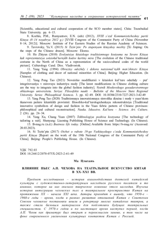 7. Шаньшань Ш., Кондаков Б.В. Интерпретация творчества А.П. Чехова в Китае (1920-1940-е гг.) // Евразийский гуманитарный журнал. 2020. № 2. С. 104-115. EDN: PUHCAW