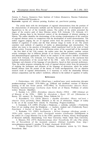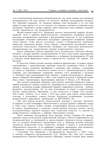 В статье рассматриваются вопросы развития регионального абстракционизма с позиции характеристики методов абстрагирования и исторического процесса развития нон-фигуративизма в искусстве ХХ века. Автор статьи представил этапы творческого пути трех сибирских художников: Н. Д. Грицюка, Т. Н. Грицюк, А. В. Насонова, поместив их в исторический контекст развития абстрактной живописи в Сибири. В результате исследования были сделаны выводы об использовании этими художниками приемов формализма, структурализма и феноменологического подхода.