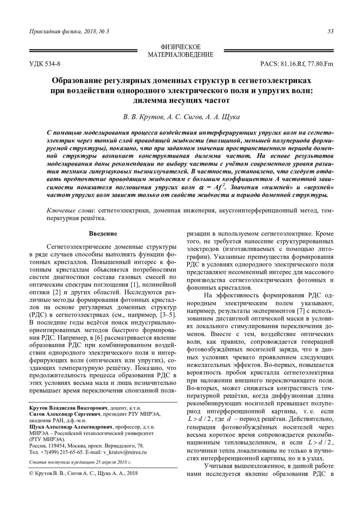 Образование регулярных доменных структур в сегнетоэлектриках при воздействии одно-родного электрического поля и упругих волн: дилемма несущих частот Крутов В. В., Сигов А. С., Щука А. А. 53