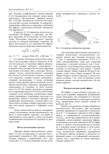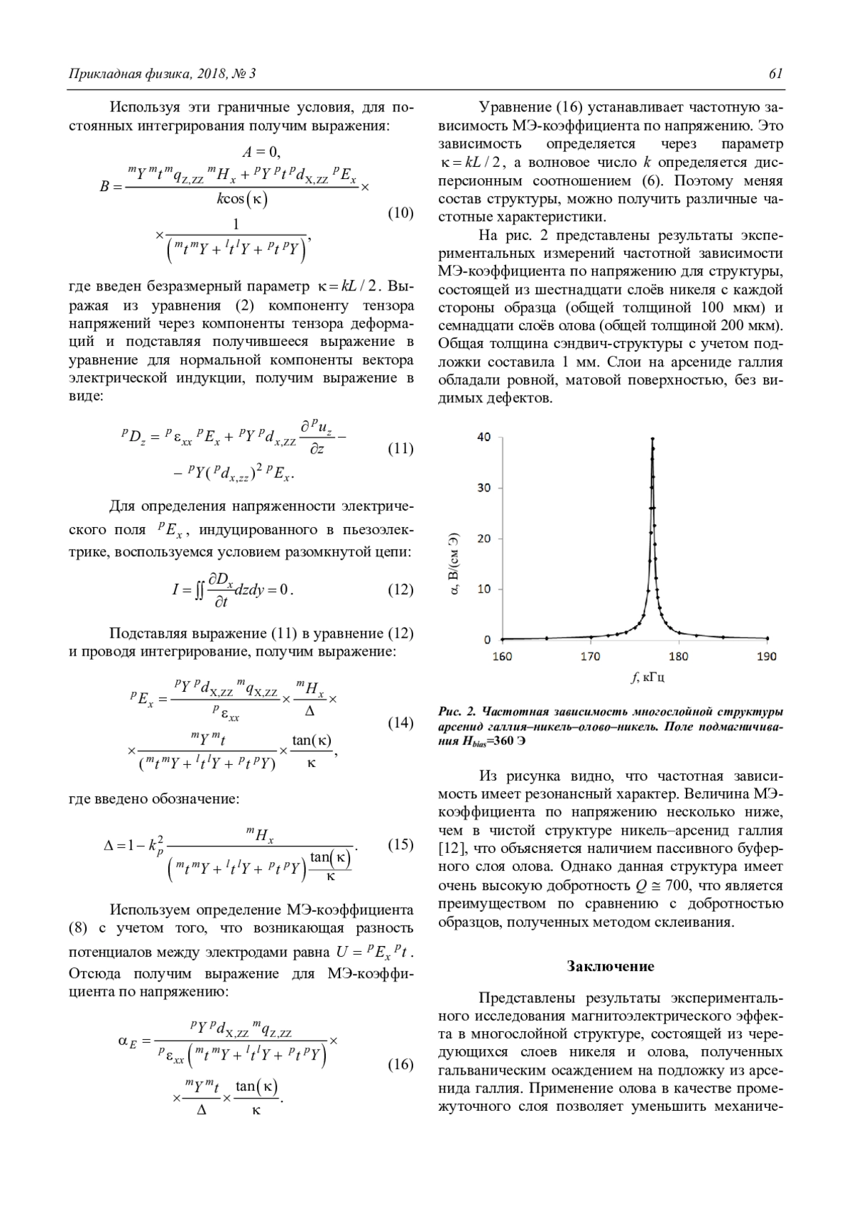 Представлены результаты экспериментального исследования магнитоэлектрического эффекта в многослойной структуре, состоящей из чередующихся слоев никеля и олова, полученных гальваническим осаждением на подложку из арсенида галлия. Применение олова в качестве промежуточного слоя позволяет уменьшить механические напряжения, возникающие на границе «никель – арсенид галлия», улучшить адгезию между слоями, что позволяет получать качественные структуры с общей толщиной никелевого слоя порядка 100 мкм. Приведены экспериментальные результаты исследования частотной зависимости эффекта в области электромеханического резонанса. Резонансное значение величины магнитоэлектрического коэффициента по напряжению достигало 40 В /(см Э) при добротности структуры Q 700, что значительно превосходит характеристики аналогичных структур, полученных методом склеивания. Такие многослойные структуры являются перспективными для конструирования приборов на основе МЭ-эффекта.