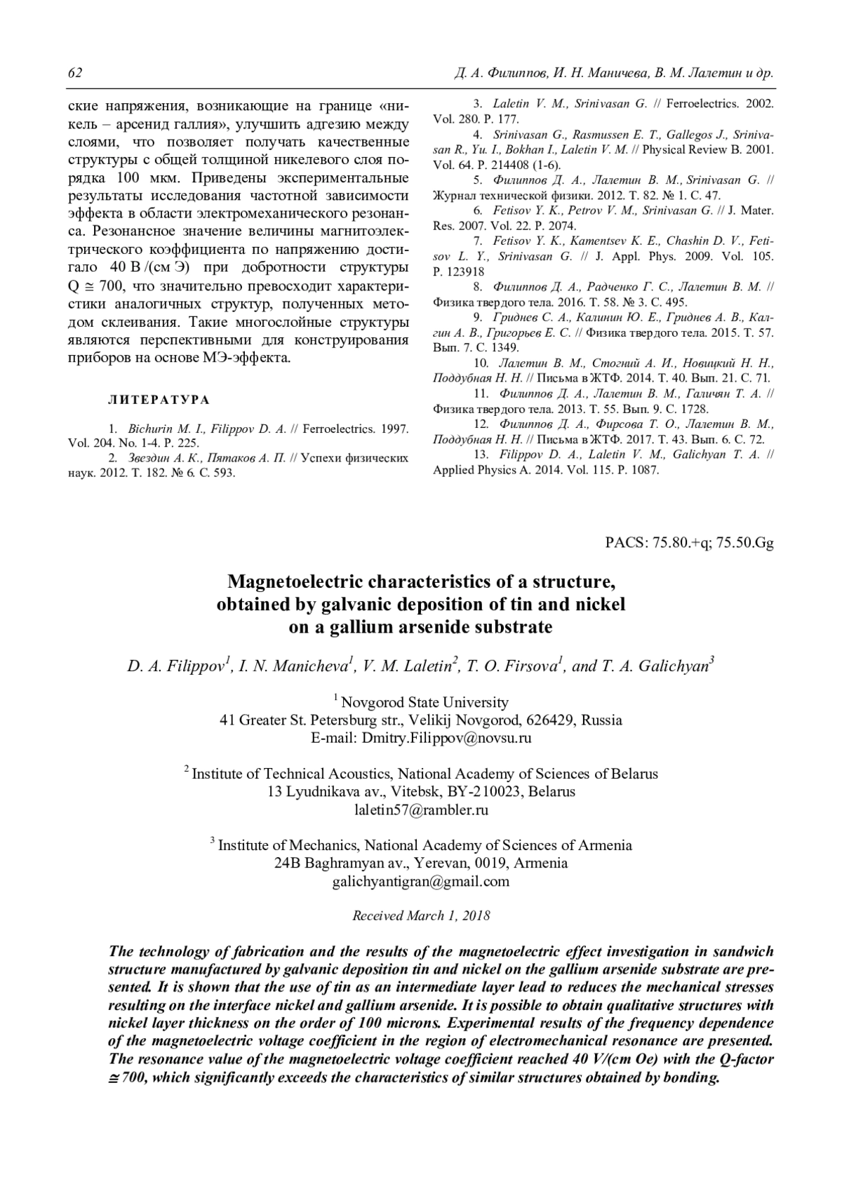 Magnetoelectric characteristics of a structure, obtained by galvanic deposition of tin and nickel on a gallium arsenide substrate D. A. Filippov, I. N. Manicheva, V. M. Laletin, T. O. Firsova, and T. A. Galichyan 58