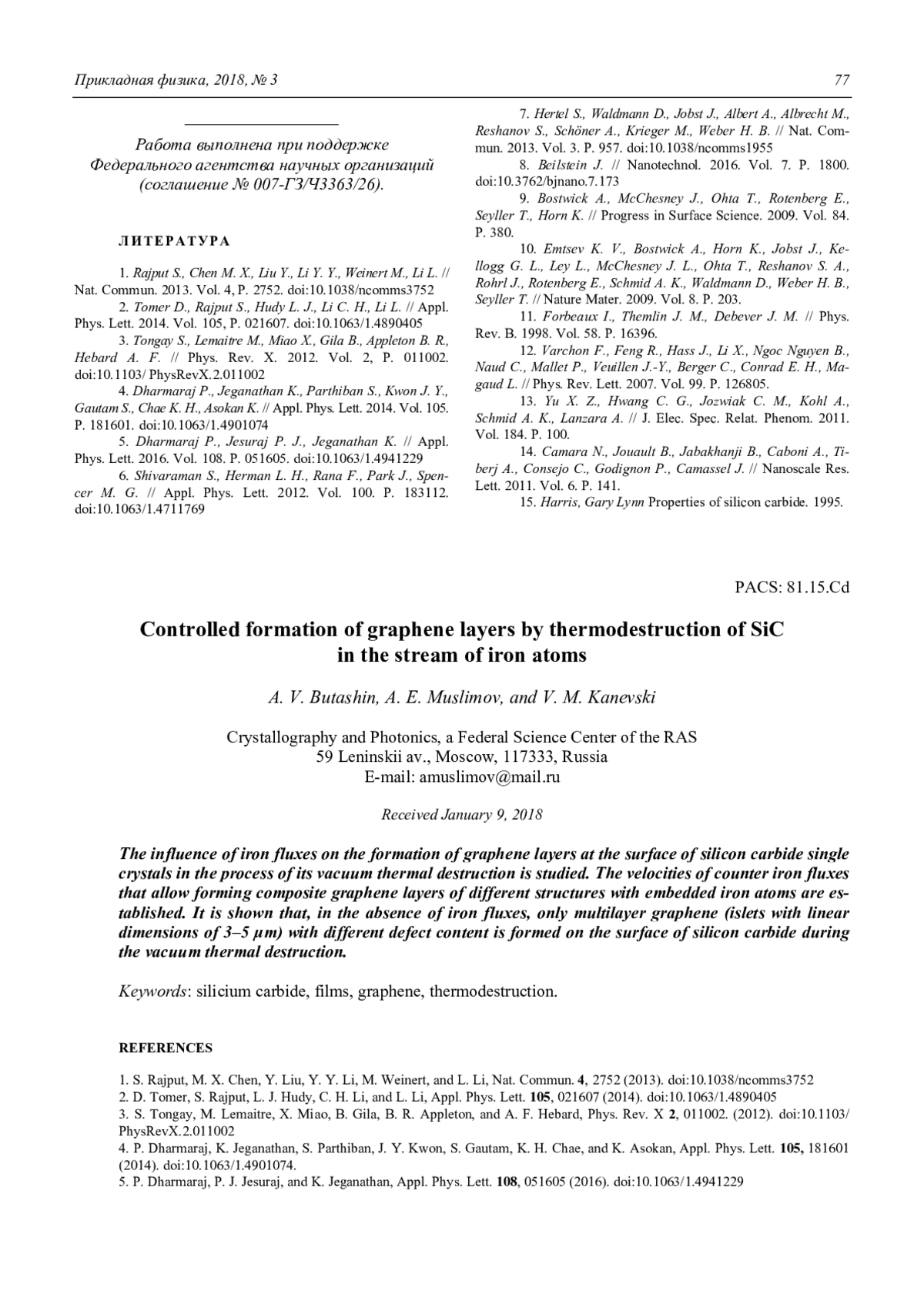 Controlled formation of graphene layers by thermodestruction of SiC in the stream of iron atoms A. V. Butashin, A. E. Muslimov, and V. M. Kanevski 74