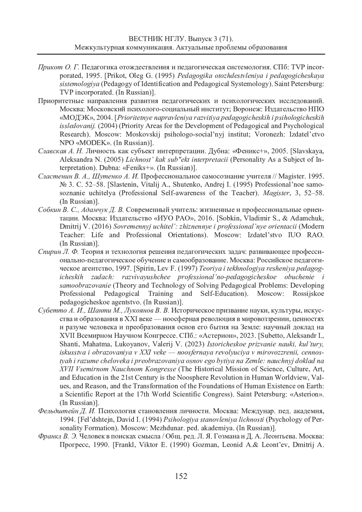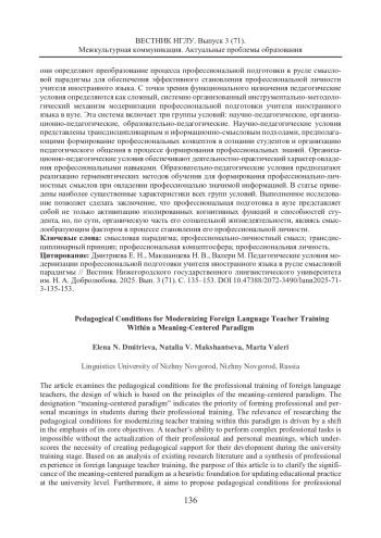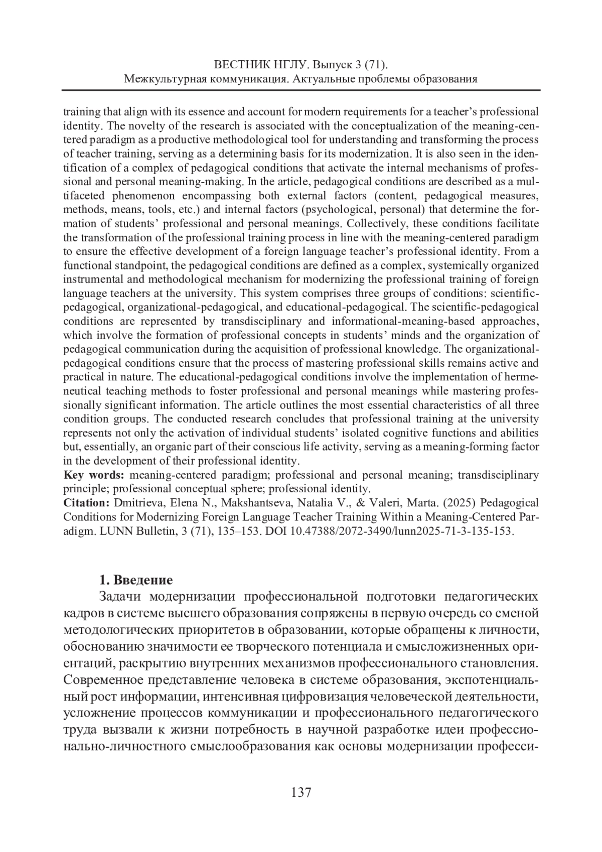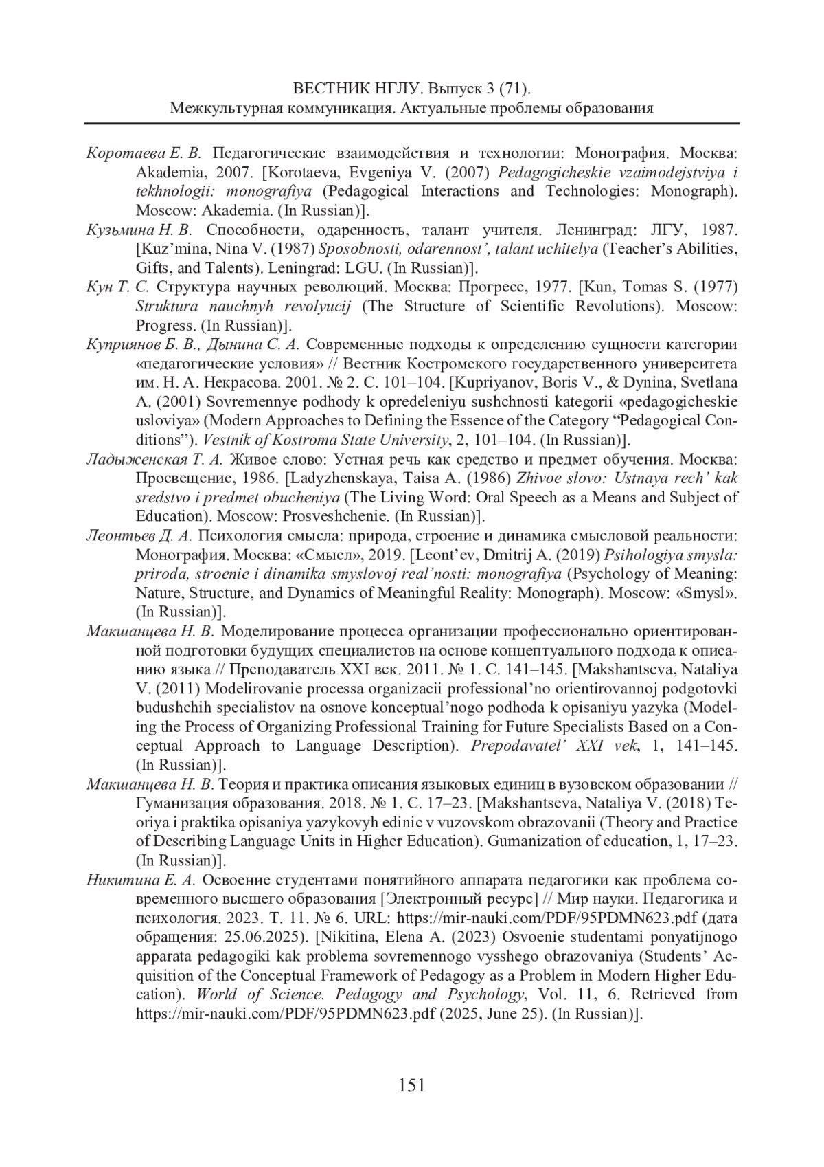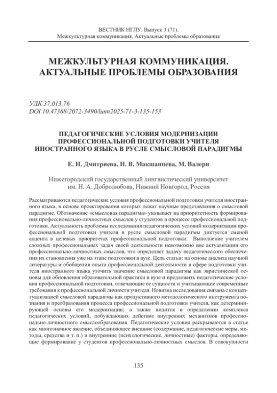 ДМИТРИЕВА Е. Н., МАКШАНЦЕВА Н. В., ВАЛЕРИ М. ПЕДАГОГИЧЕСКИЕ УСЛОВИЯ МОДЕРНИЗАЦИИ ПРОФЕССИОНАЛЬНОЙ ПОДГОТОВКИ УЧИТЕЛЯ ИНОСТРАННОГО ЯЗЫКА В РУСЛЕ СМЫСЛОВОЙ ПАРАДИГМЫ // ВЕСТНИК НИЖЕГОРОДСКОГО ГОСУДАРСТВЕННОГО ЛИНГВИСТИЧЕСКОГО УНИВЕРСИТЕТА ИМ. Н. А. ДОБРОЛЮБОВА. 2025. № 3 (71)