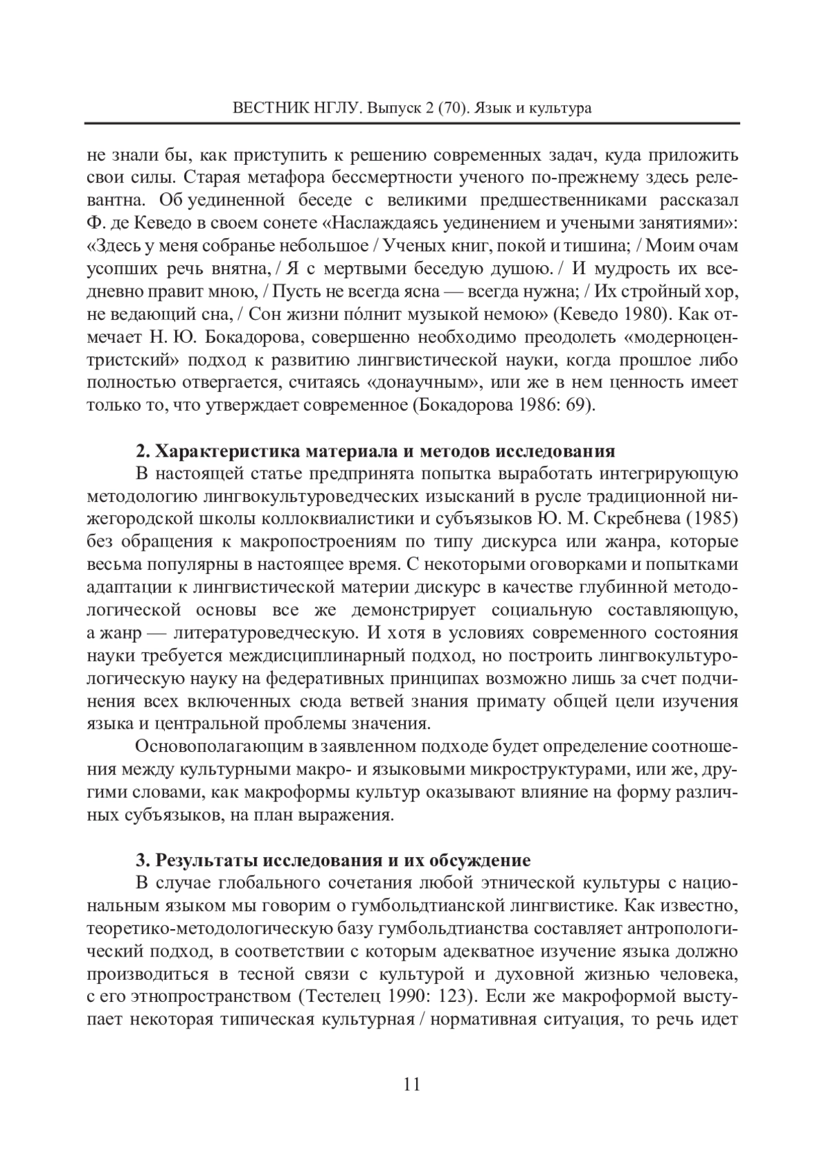 В настоящей статье предпринята попытка выработать интегрирующую методологию лингвокультуроведческих изысканий в русле традиционной нижегородской школы коллоквиалистики и субьязыков Ю. М. Скребнева (1985) без обращения к макропостроениям по типу дискурса или жанра, которые весьма популярны в настоящее время. С некоторыми оговорками и попытками адаптации к лингвистической материи дискурс в качестве глубинной методологической основы все же демонстрирует социальную составляющую, а жанр — литературоведческую. И хотя в условиях современного состояния науки требуется междисциплинарный подход, но построить лингвокультурологическую науку на федеративных принципах возможно лишь за счет подчинения всех включенных сюда ветвей знания примату общей цели изучения языка и центральной проблемы значения.