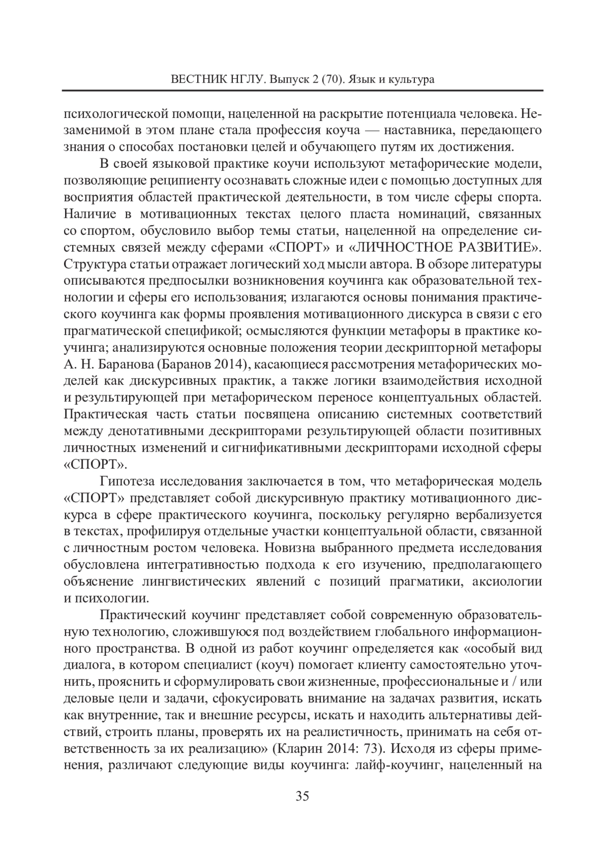 Необходимость адаптации человека к современным условиям жизни способствует появлению множества форм общения; особую популярность в этой связи приобрела инновационная образовательная практика коучинга, зарекомендовавшая себя за последние десятилетия как эффективное средство развития гармоничной личности. Коучинговый подход применяется в качестве основного способа мотивации в профессиональной и образовательной сферах, а также в области межличностного взаимодействия и самосовершенствования. Метафора, будучи незаменимым средством в построении мотивационных текстов, обладает значительным когнитивным и дидактическим потенциалом: с одной стороны, благодаря метафоре человек познает действительность, с другой - данный механизм обеспечивает наглядность в объяснении сложных понятий и идей. Использование в практическом коучинге определенных метафорических моделей позволяет коучу создать благоприятный фон, обеспечивающий убедительность сказанного. Настоящая работа посвящена метафорической модели «СПОРТ»: на материале немецкоязычных статей, представляющих собой рекомендации по личностному развитию, определяются системные корреляции между исходной сферой спорта и сферой индивидуального роста человека. Потребность в выявлении языковых способов мотивации обусловила актуальность исследования, позволяющего расширить знания об эффективности используемых коучами метафорических моделей в рамках различных коммуникативных стратегий, что способствует усовершенствованию практики коучинга в целом. Посредством метода метафорического моделирования, предполагающего определение наиболее значимых комбинаций сигнификативных и денотативных дескрипторов, описывается специфика профилирования отдельных участков результирующей области в терминах спорта. Исследование показало, что модель «СПОРТ» позволяет осмыслить прилагаемые человеком в процессе личностного развития волевые усилия и умение противостоять внешним обстоятельствам и внутренним психологическим препятствиям, а также осознать самостоятельность в принятии индивидом решений и используемые им стратегии. Работа обладает теоретической значимостью, поскольку вносит вклад в развитие теории концептуальной метафоры; практическая ценность статьи заключается в возможности использования ее положений в курсах по дискурсологии, коммуникативистике, когнитивной лингвистике, а также при создании пособий по практическому коучингу.