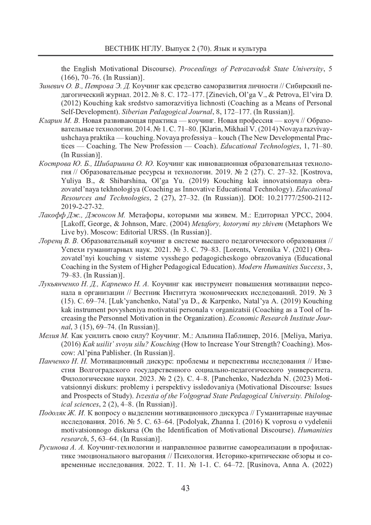 4. Букина Ю. В. Подходы к пониманию мотивационного дискурса в современной гуманитарной парадигме // Международный журнал экономики и образования. 2022. Т. 8. № 1. С. 42-58. EDN: MMGKEA