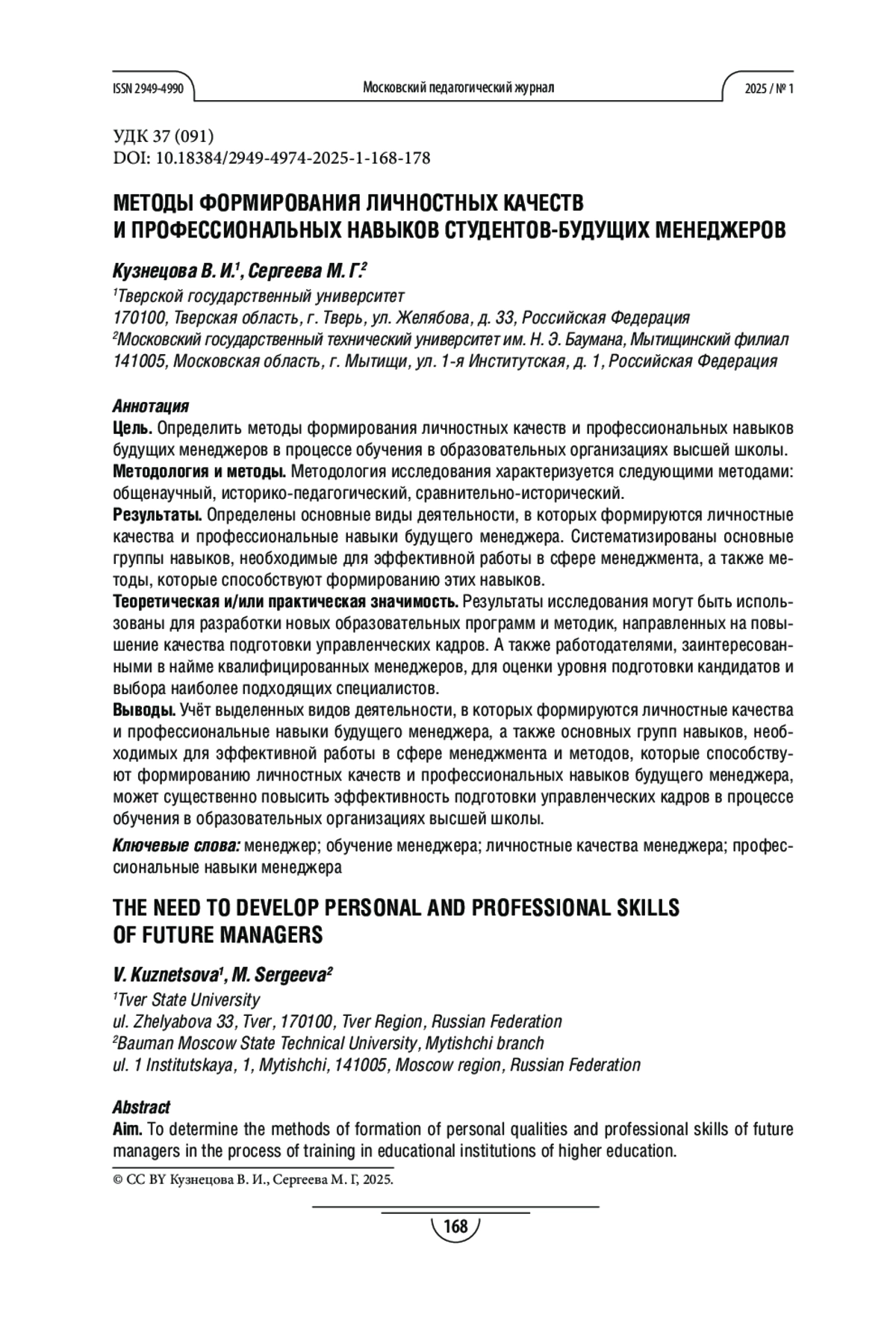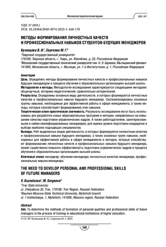 Цель. Определить методы формирования личностных качеств и профессиональных навыков будущих менеджеров в процессе обучения в образовательных организациях высшей школы.