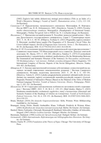 16. Филлипова С. Г. Прагматика заглавий романов X. Хоссейни: межкультурный аспект // Вестник Дагестанского государственного университета. Серия 2: Гуманитарные науки. 2021. T. 36. № 4. С. 88-94. EDN: COBOLD