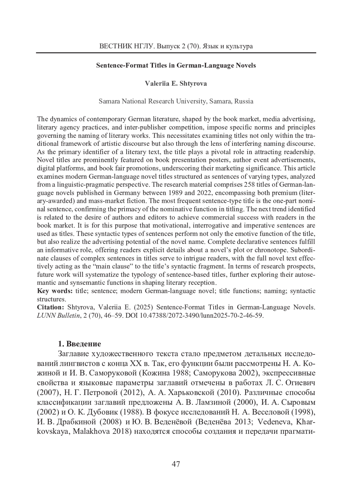 18. Штырова В. Э. Лексико-прагматический потенциал субстантивных словосочетаний (на материале заглавий современных немецкоязычных романов) // Вестник Самарского университета. История, педагогика, филология. 2023. Т. 29. № 2. С. 183-191. EDN: EXZFTY