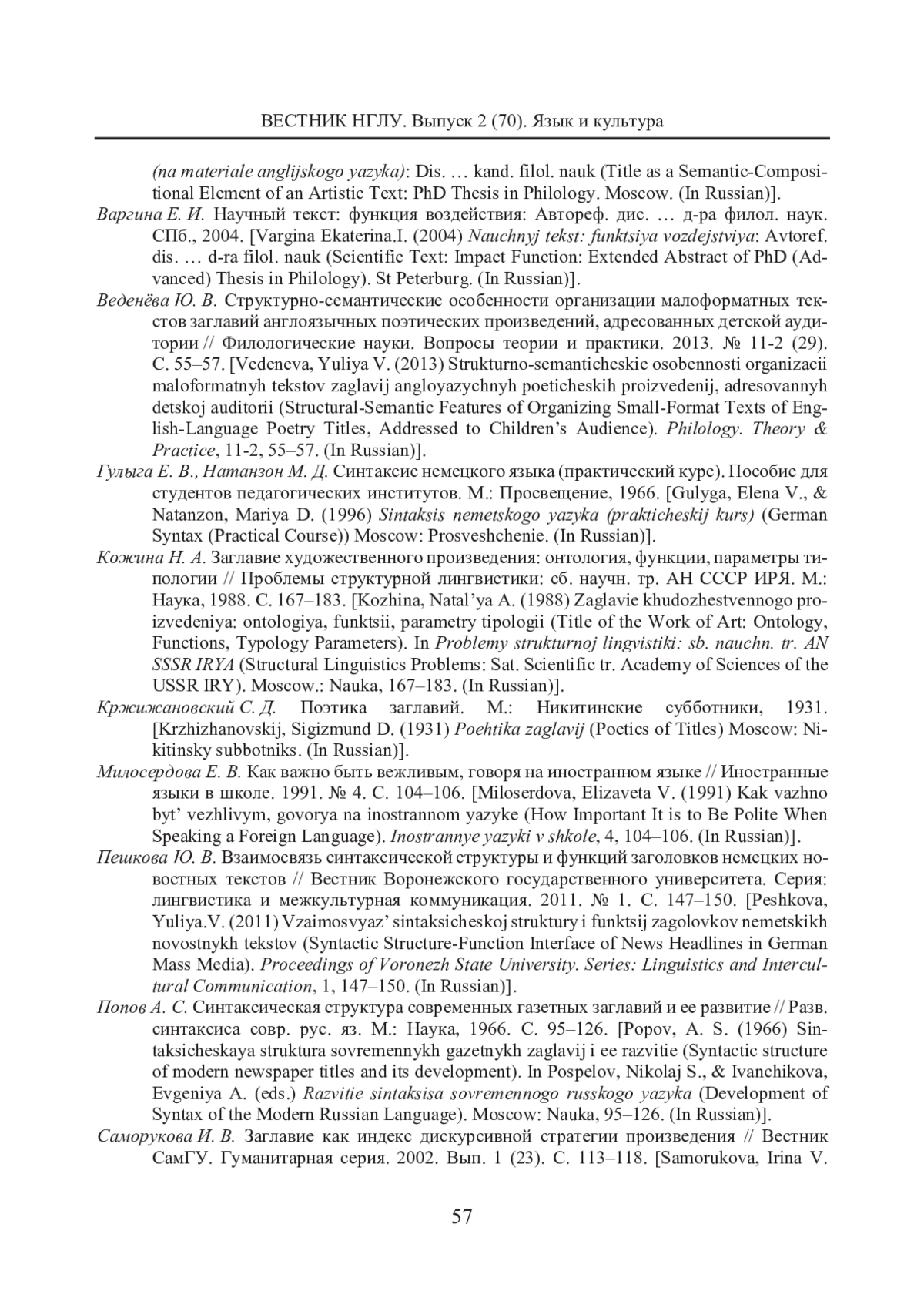 12. Пешкова Ю. В. Взаимосвязь синтаксической структуры и функций заголовков немецких новостных текстов // Вестник Воронежского государственного университета. Серия: лингвистика и межкультурная коммуникация. 2011. № 1. С. 147-150.