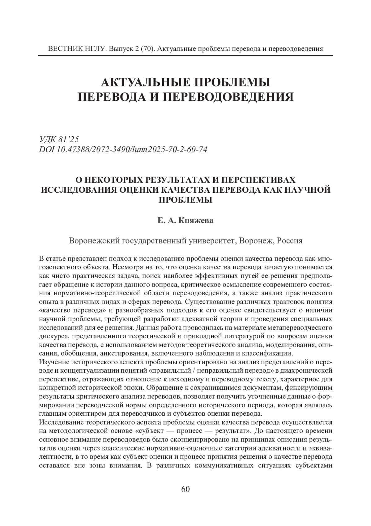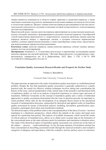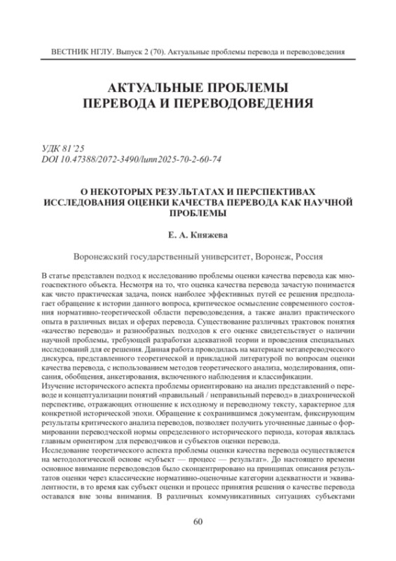 10. Княжева Е. А. О некоторых аспектах исследования проблемы оценки качества перевода // Вестник Московского университета. Серия 22. Теория перевода. 2024а. Т. 17. № 1. С. 98-119. EDN: JSJNFW